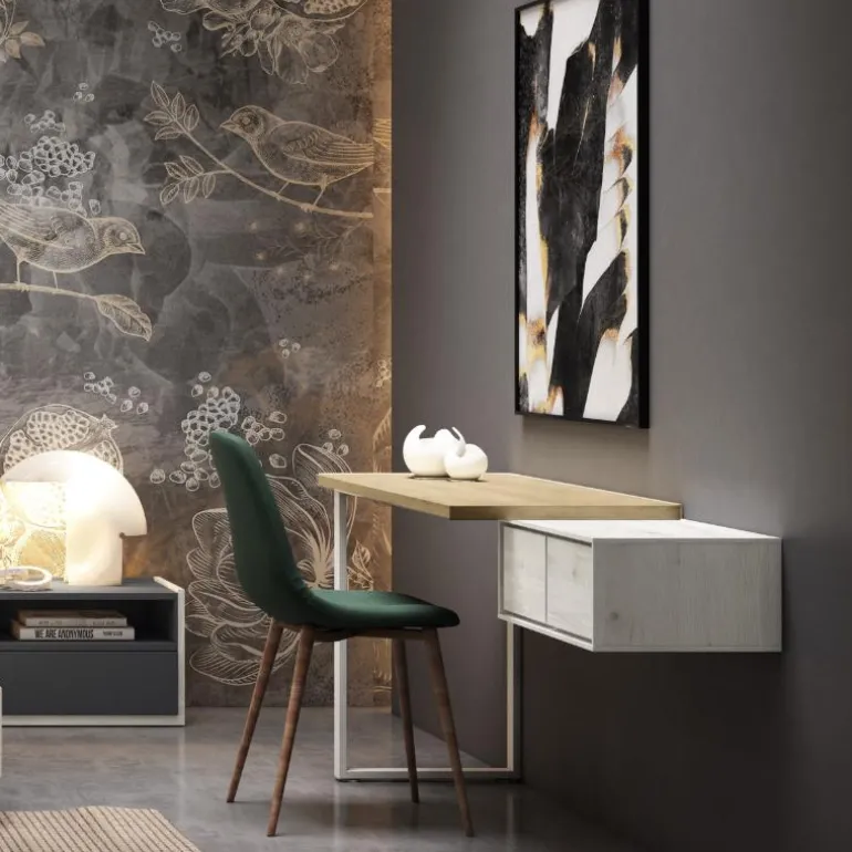 Y mesitas con 1 cajón en mismo acabado madera nórdica y gris pizarra, con cajón con tirador con sistema push. Y bancada a juego suspendida con esquinas rectas. Todo a la última en decoración.