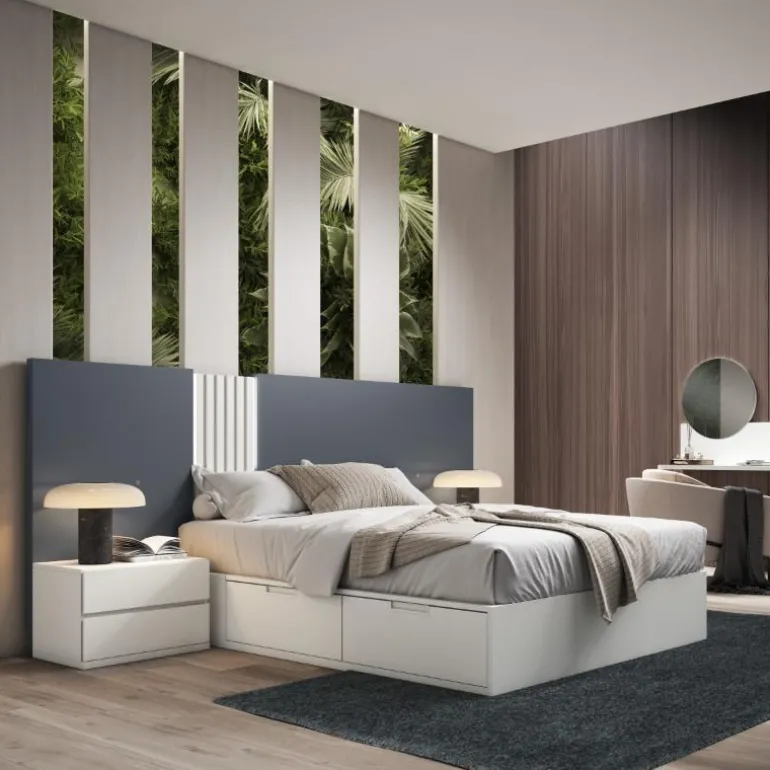 Dormitorios moderno Quintana Basalto. Cabecero asimétrico con un diseño actual y moderno, con listones verticales y frente en dos posibles colores, a la última en decoración.