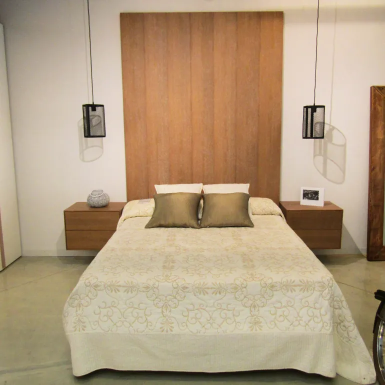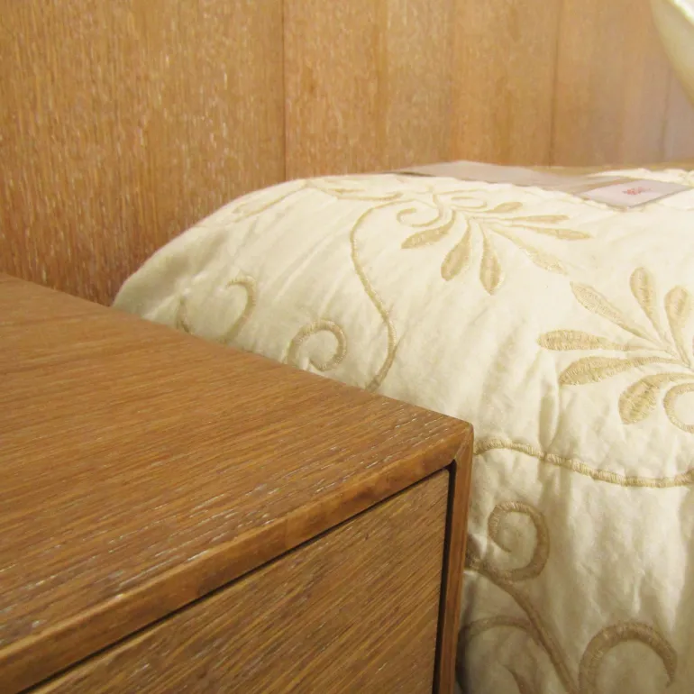 Dormitorio de matrimonio de gran calidad de fabricación, compuesto por un gran cabecero creado a base de un cabezal de gran altura y de 4 cm de grosor en chapa de roble seleccionada continua con acabado especial artesanal. Dos mesillas fabricadas por completo en chapa de roble, con dos cajones cada una, con sistema push y de freno en el cierre.