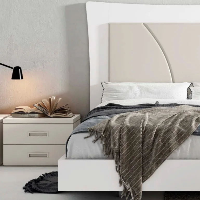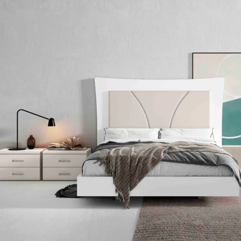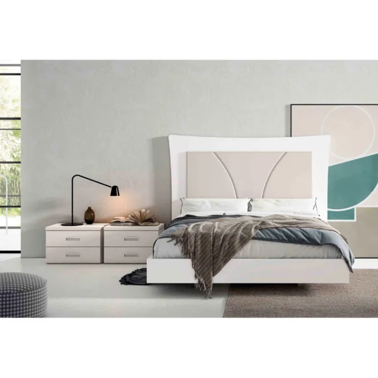 Dormitorio Polo Atenas. Dormitorio de matrimonio con un diseño actual y moderno, en fotografía está en acabado ecomadera Blancera y centro Lacado en Coco (beige), una combinación muy moderna, pero puede escoger la que usted prefiera. Y mesitas acabado Coco (beige) con tirador embutido también acabado Lacado Coco, y bancada volada y esquinas rectas en Laca Lacablanca.
