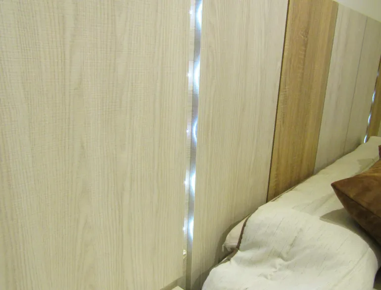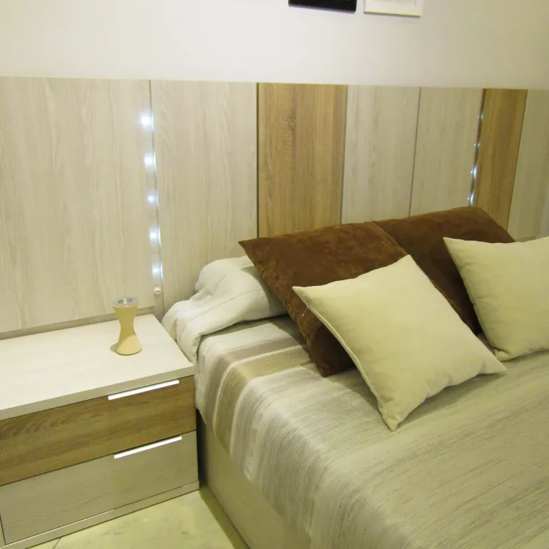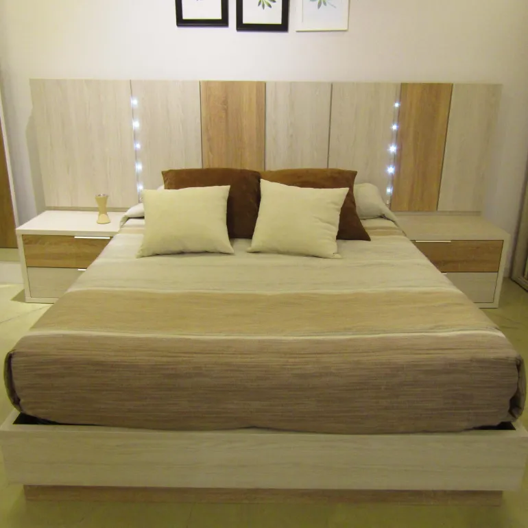 Dos mesillascon acabado en ecomadera en dos tonos con tiradores finos, y sistema autocierre para evitar golpes. El cabecero también en acabado en ecomadera, pero destaca por 2 hendiduras donde se alojan las luces leds, sobre fondo de ecomadera, para darle más diseño, si cabe.