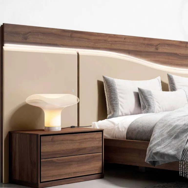 Dormitorio Viena Nogal. Dormitorio de matrimonio con un diseño actual y moderno, en fotografía está en acabado ecomadera Nogal y parte central Lacado Café, y mesillas ecomadera Nogal sin tiradores, además de iluminación LED incluida.