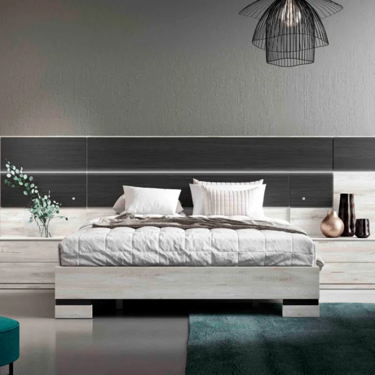 Dormitorios Berli Rústico. Dormitorio de matrimonio con un diseño actual y moderno, en fotografía está en acabados ecomadera Roble Rústico y Laca oscura Volcan (Y Roblerus y Arcilla), una combinación que contrasta muy bien, pero puede escoger la que usted prefiera. Y mesitas en acabado ecomadera Roble Rústico con sistema Push, y bancada con patas (Y volada) en líneas rectas y acabado ecomadera Roble Rústico (Y Roblerus), además de iluminación LED incluida.