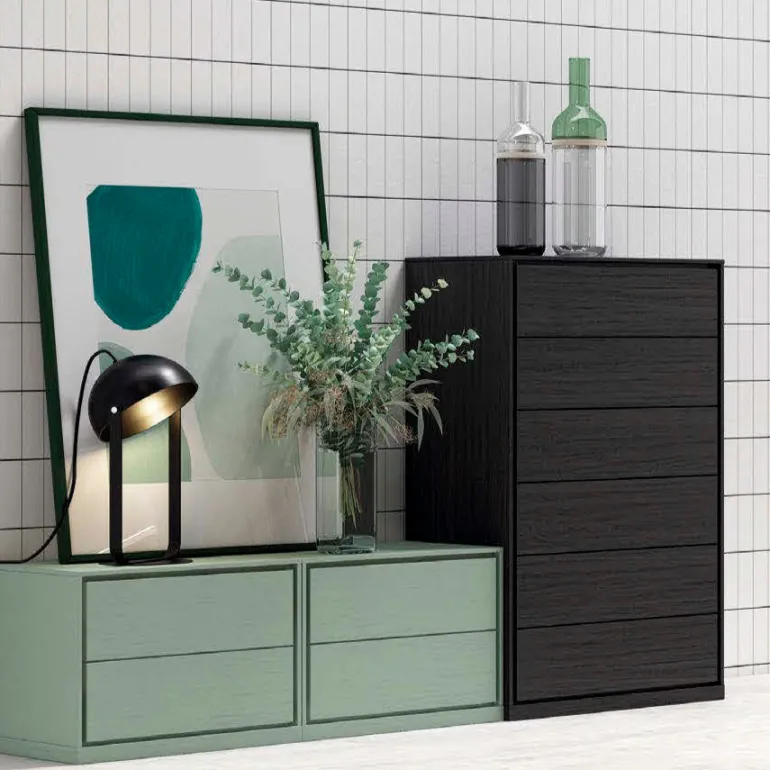 Está fabricado en ecomadera e incluye sistema de retención en sus cajones, para evitar golpes y prolongar la vida útil del cajón. Con un bonito cabezal en el que se combinan diferentes acabados. Un Sifonier de 6 cajones en acabado ecomadera negra Mina y Cómoda de 4 cajones en acabado Arcilla.