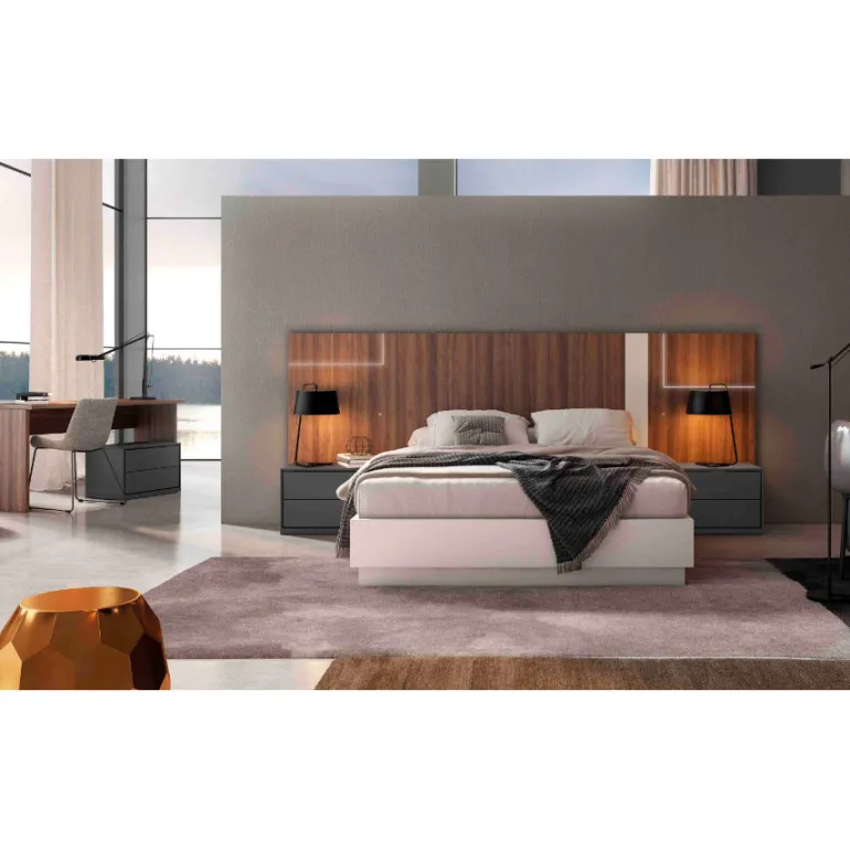 Dormitorios Yelhi Nogal. Dormitorio de matrimonio con un diseño actual y moderno, en fotografía está en acabado ecomadera Nogal con detalle en Lacado Coco, una combinación que contrasta muy bien, pero puede escoger la que usted prefiera. Y mesitas en acabado Lacado Pizarra con sistema Push, y bancada con arcón elevable y acabado Lacado Coco, además de iluminacin LED incluida. También incluye un escritorio con cajonera en Lacados Nogal y Pizarra respectivamente.