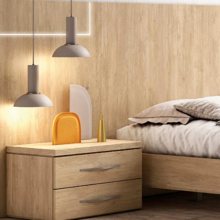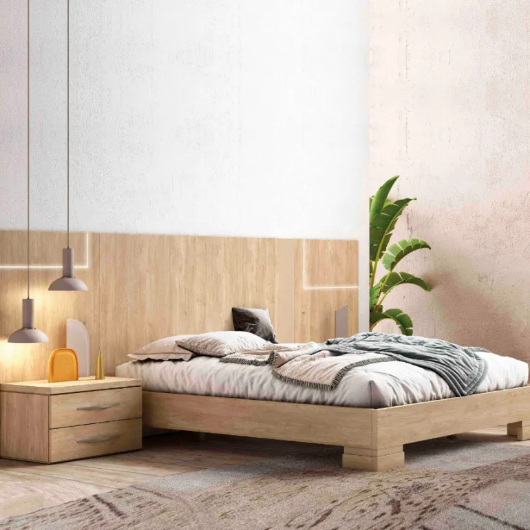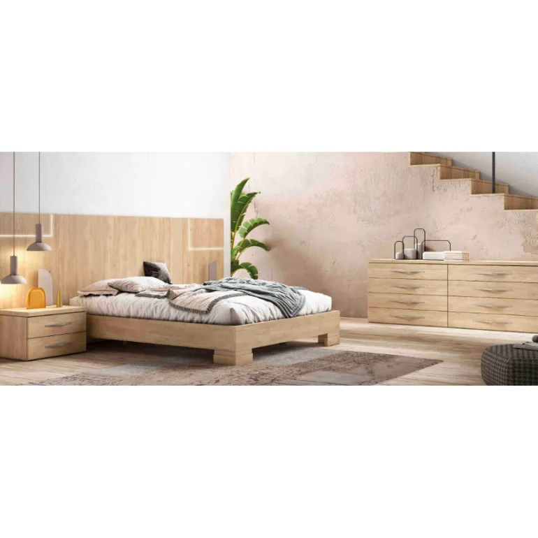 Dormitorios Yelhi Roble. Dormitorio de matrimonio con un diseño actual y moderno, en fotografía está en acabado ecomadera Roblerus, un acabado de color Roble que combina muy bien, pero puede escoger la que usted prefiera. Y mesitas en acabado Roblerus con tiradores en arco, y bancada con patas en líneas rectas y acabado Roblerus con detalle de Lacado Café en las patas, además de iluminación LED incluida.