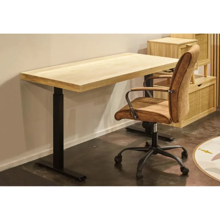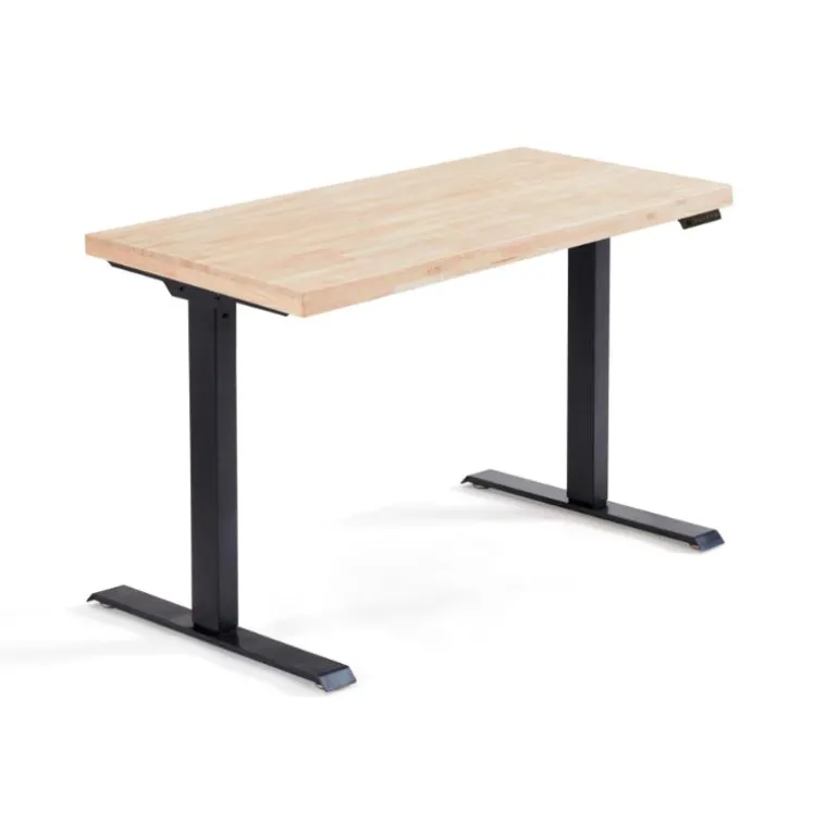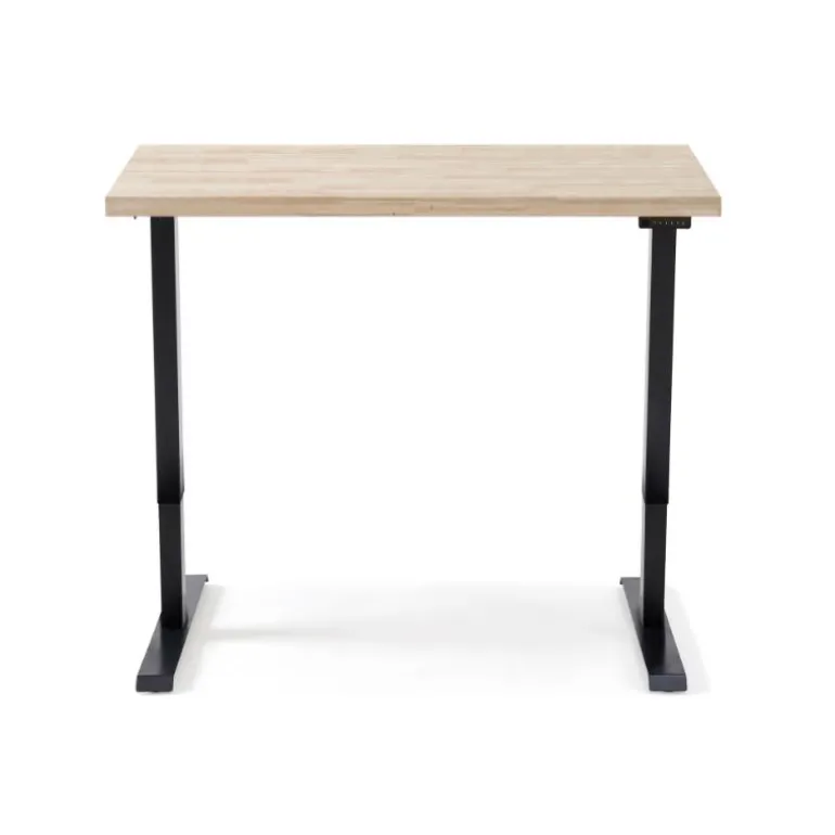 Escritorio elevable eléctrico con acabado tapa en madera de roble maciza color nórdico. Estructura metálica color negro elevable motorizada eléctrica. Accionamiento mediante botonera frontal. Topes de suelo regulable en altura.