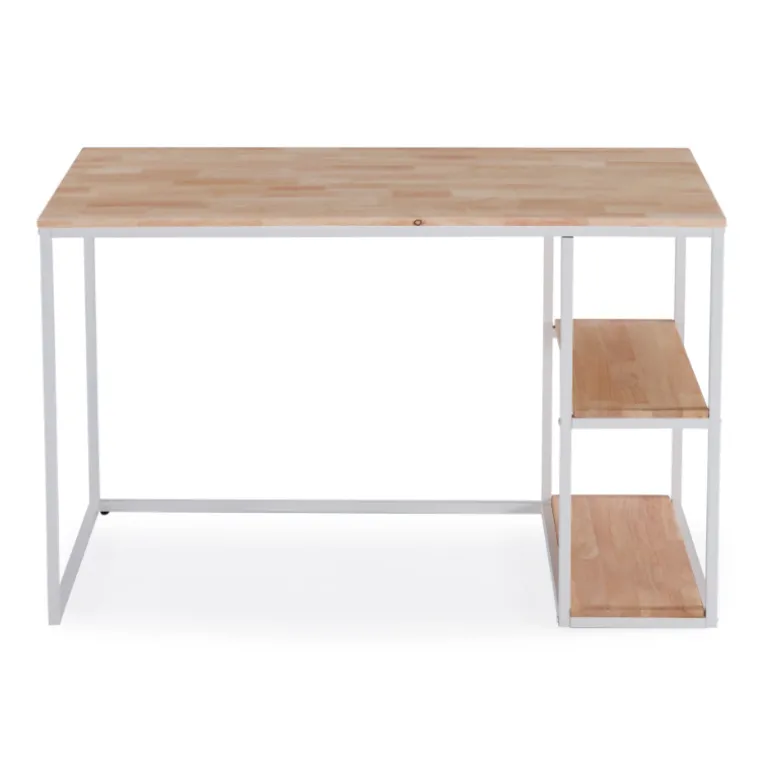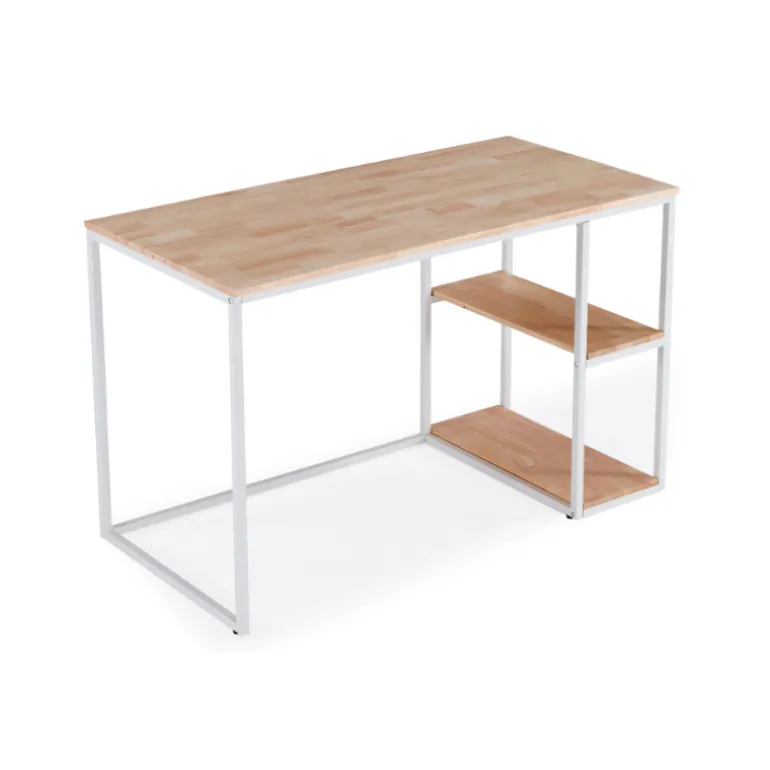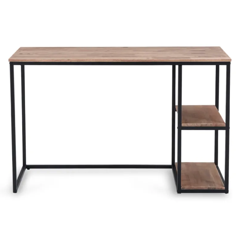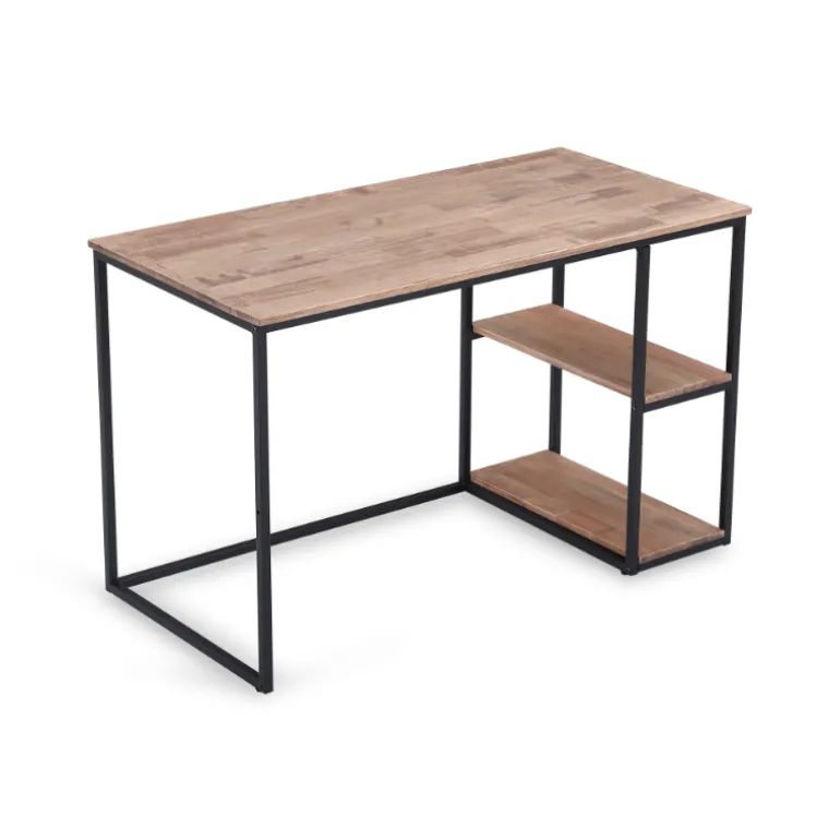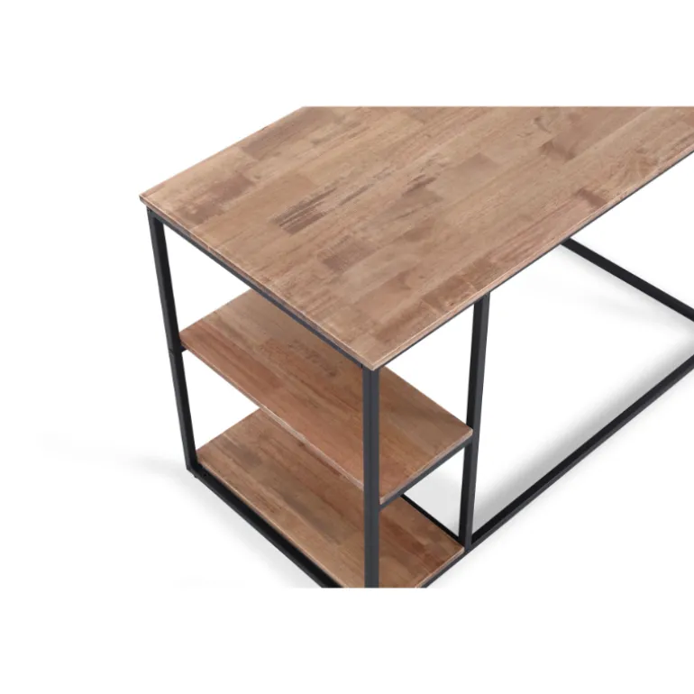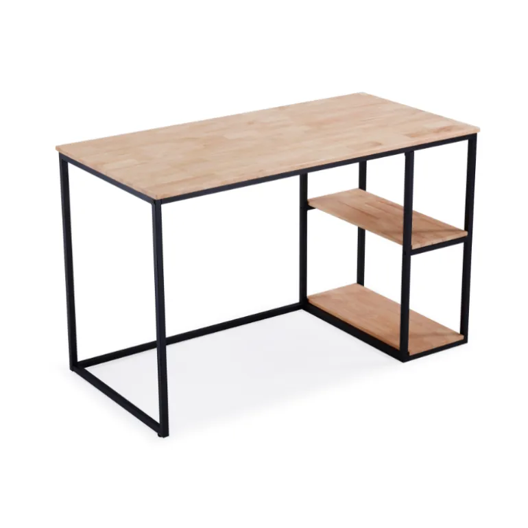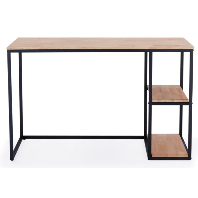Moderna mesa de estudio de tapa de roble macizo (fabricado a base de láminas de madera maciza entrelazadas) y patas forjado con pintura epoxy color negro, lo que lo hace muy resistente al paso de los años. Se trata de un estilo urbano industrial muy actual, combinará muy bien con cualquier decoración.