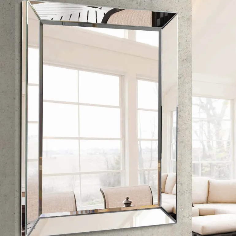 Bonito espejo simétricorectangulardecorativo, formado porun marco grueso liso inclinadoy una parte central lisa.