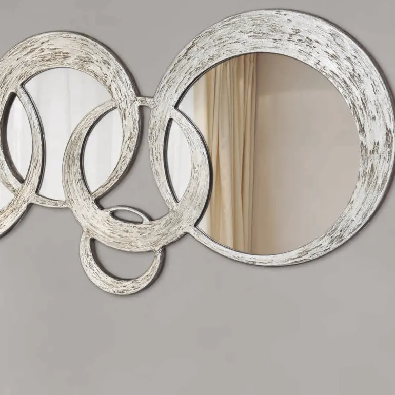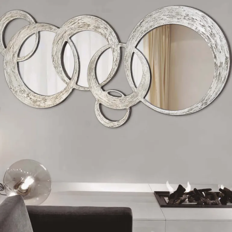 Espejo decorativo en acabado pan de plata texturizado, de estilo moderno formado por6 grandesesferas, que juntas entre si forman un original espejo. Por sus formas y dibujo podrás ubicarlo tanto en ambientes modernos como clásicos con aires renovados. Además podrás colocarlo tanto en posición vertical como horizontal.