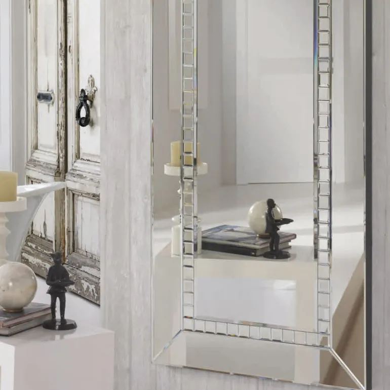 Bonito espejo simétricorectangulardecorativo, formado porun marco grueso liso con un mosaico de pequeños cristales, y una parte central lisa.