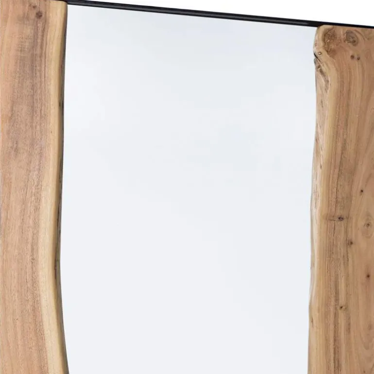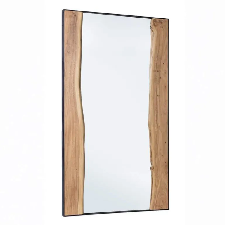 Espejo de estilo moderno, hecho de madera de acacia maciza con acabado natural y marco de hierro