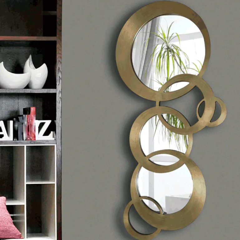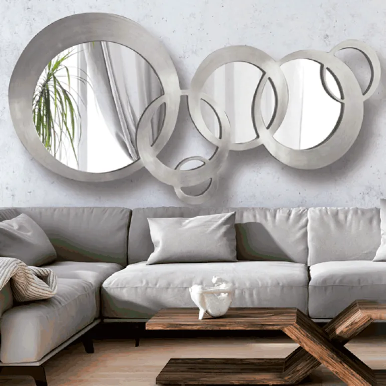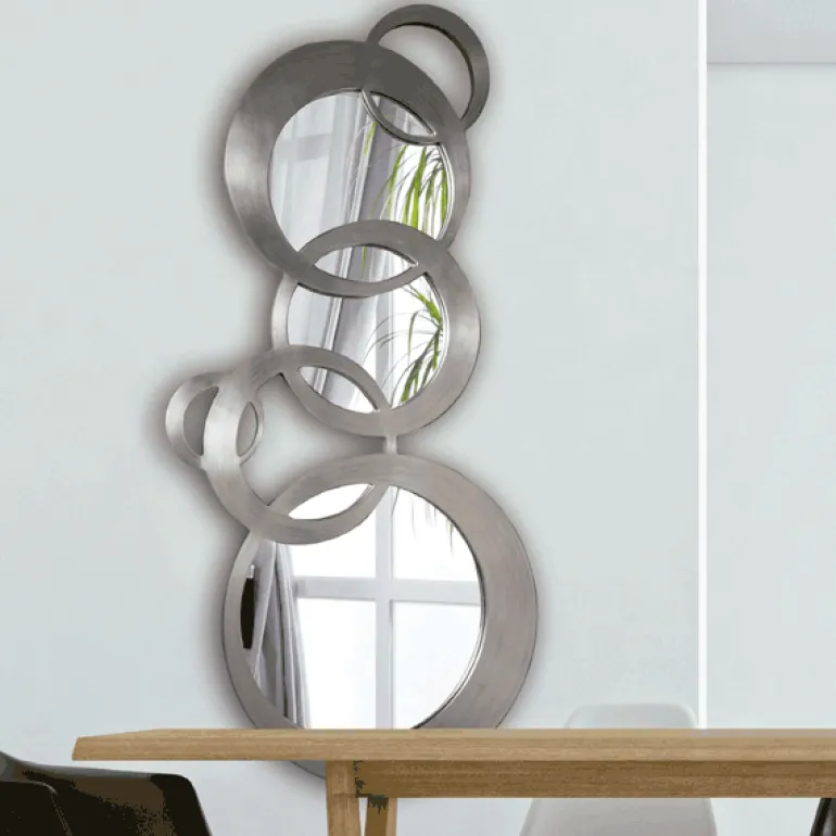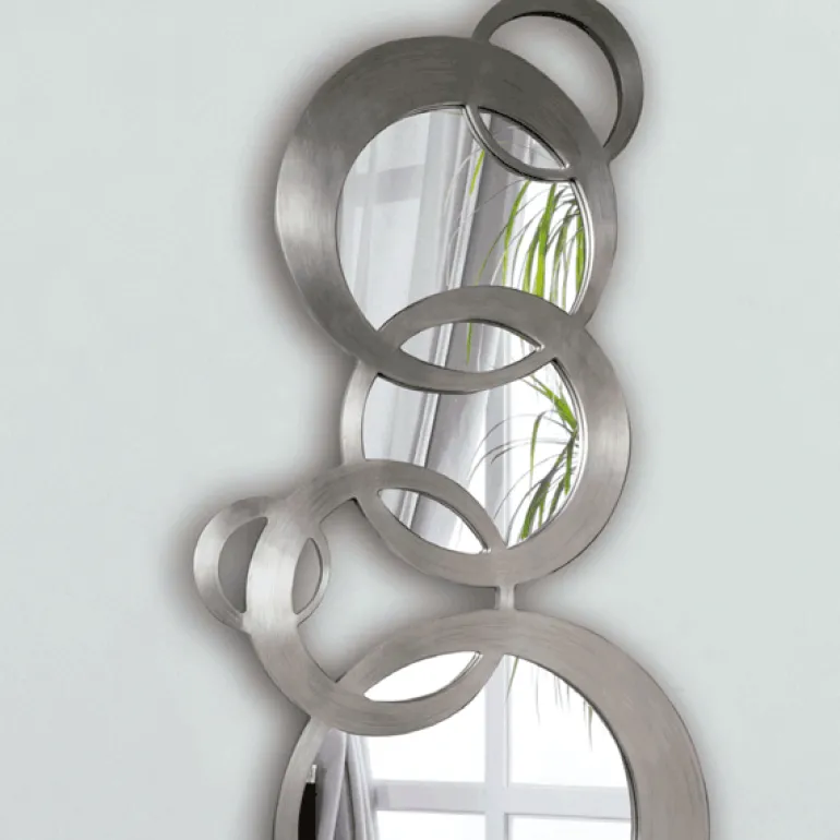 Espejo decorativo en plata, acabado en pan de plata color champagne, de estilo moderno formado por una serie deesferas redondas de diferentes tamaños que juntas entre si forman un original espejo. Por sus formas y dibujo podrás ubicarlo tanto en ambientes modernos como clásicos con aires renovados. Además podrás colocarlo tanto en posición vertical como horizontal.