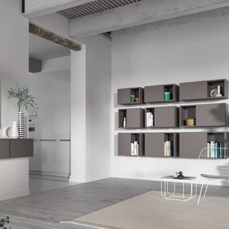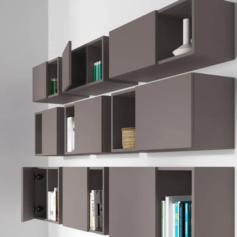 Estantería configurada por cubos altos colgados con puertas asimétricas de diferentes alturas y anchos que conjugan la estética con la práctica.