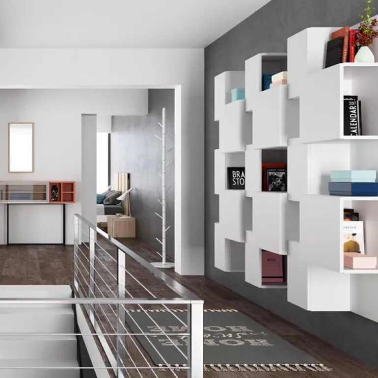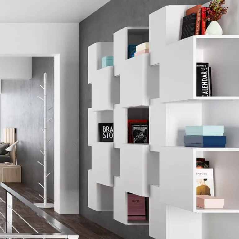 Estantería compuesta por cubos y estantes formando una composición muy moderna.