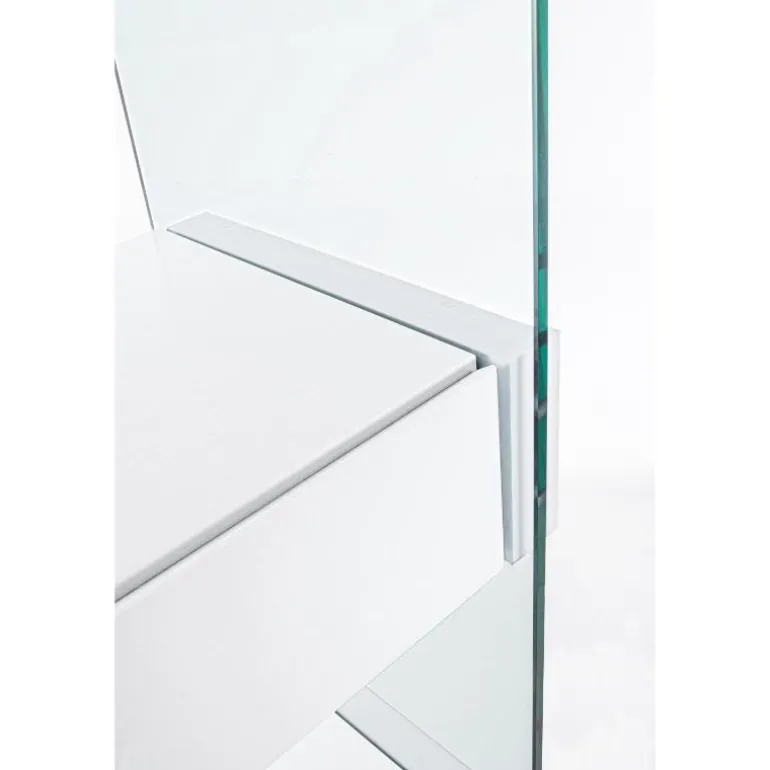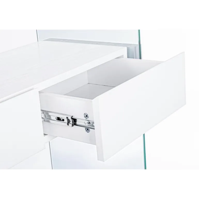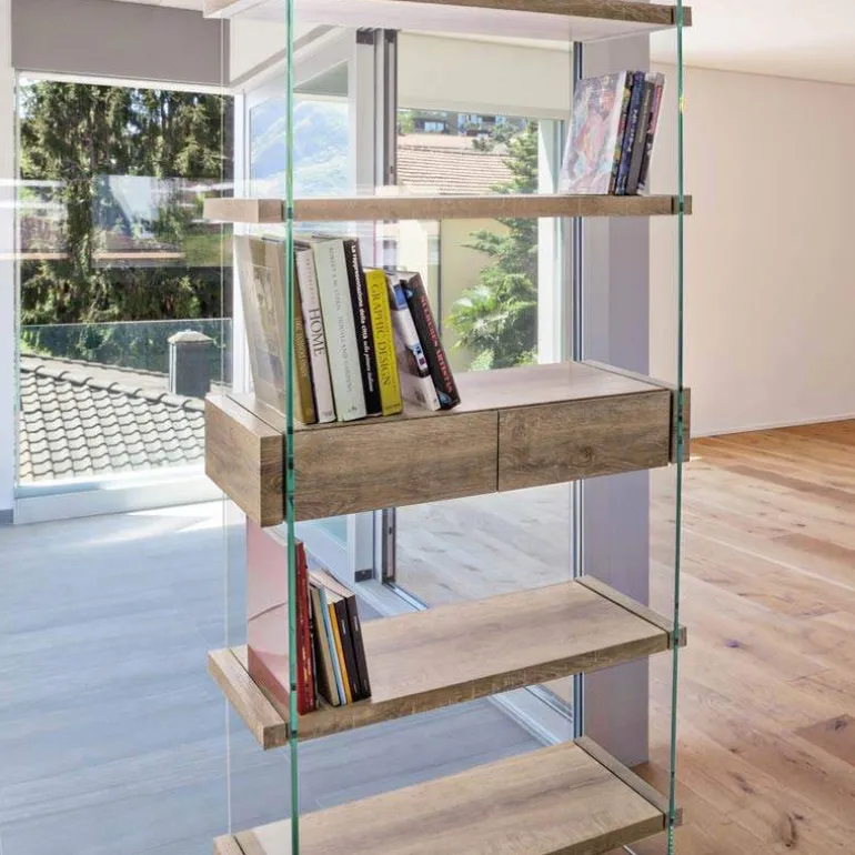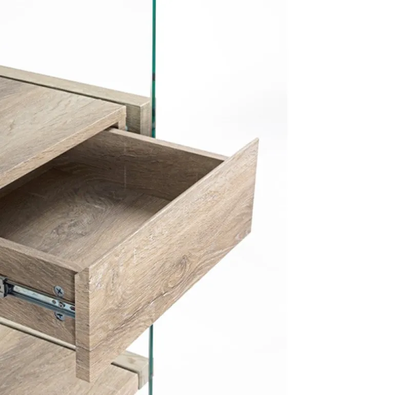 Moderna estantería de diseño, fabricada en cristal templado y ecomadera roble rústico con 2 cajones en la zona central. y también en blanco.
