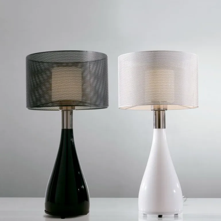 Lámpara circular de sobremesa moderna, con base de cerámica de color negro y pantalla metálica negra agujereada.