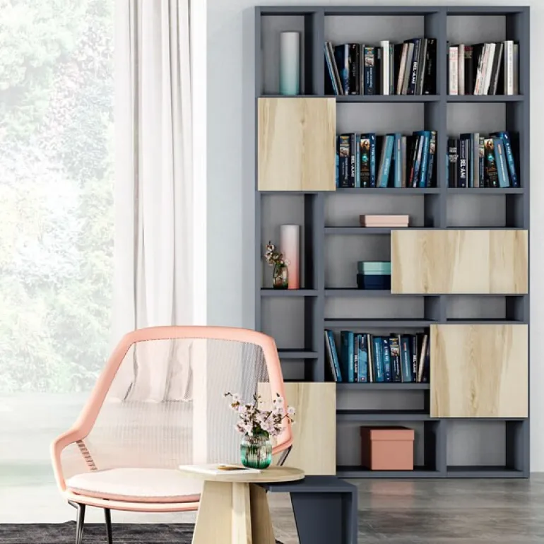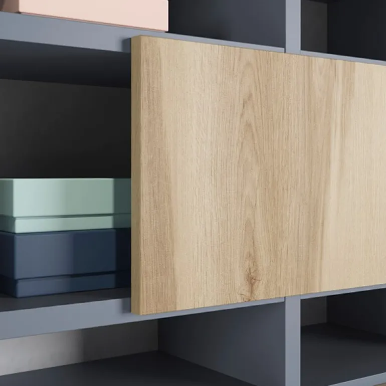 Librería en la que se combinan cajones y huecos libres, creando una composición muy actual y elegante, en colores storm y legno. Las puertas de los cajones sobresalen haciendo la función de tirador.