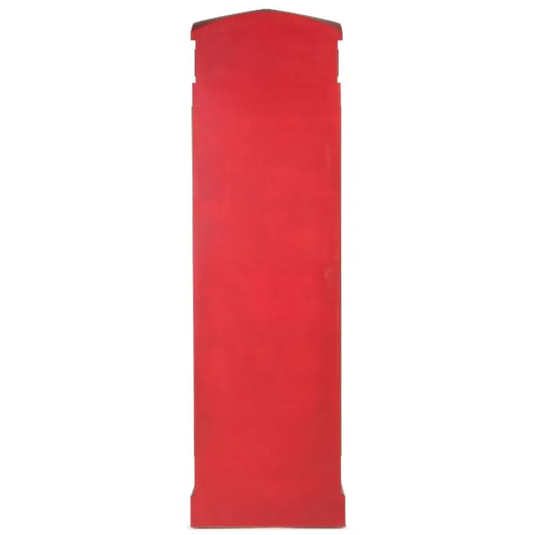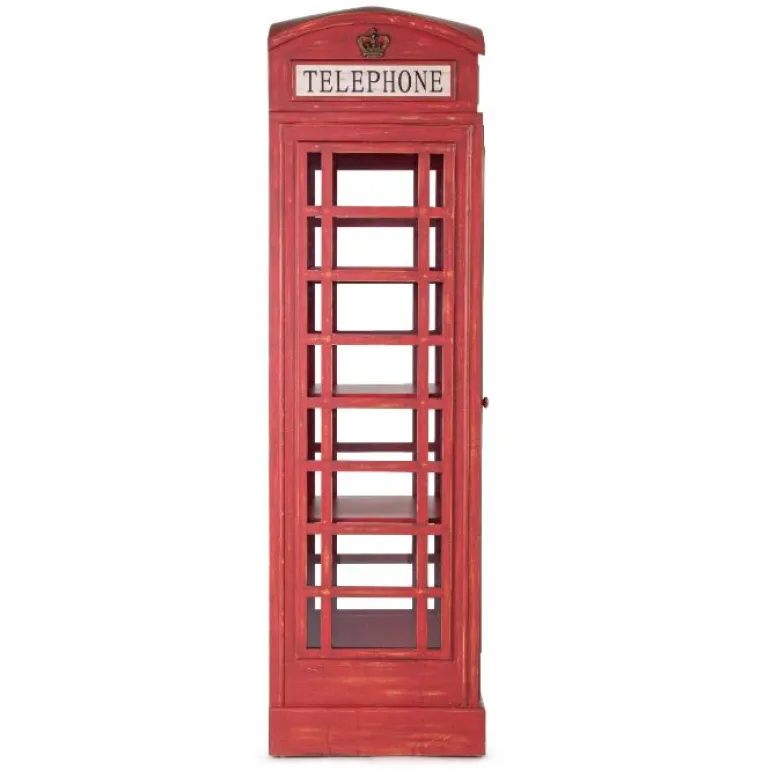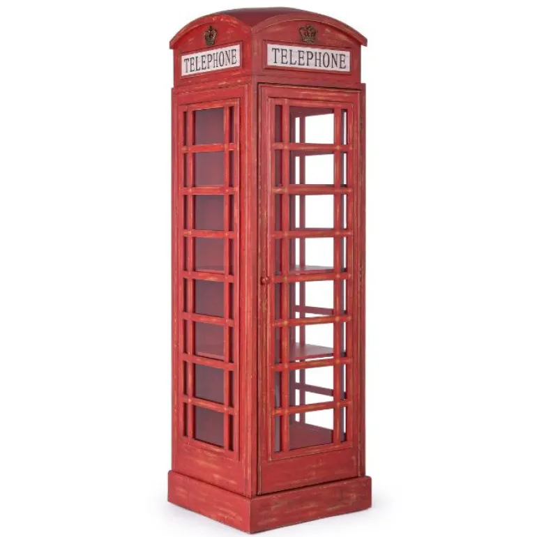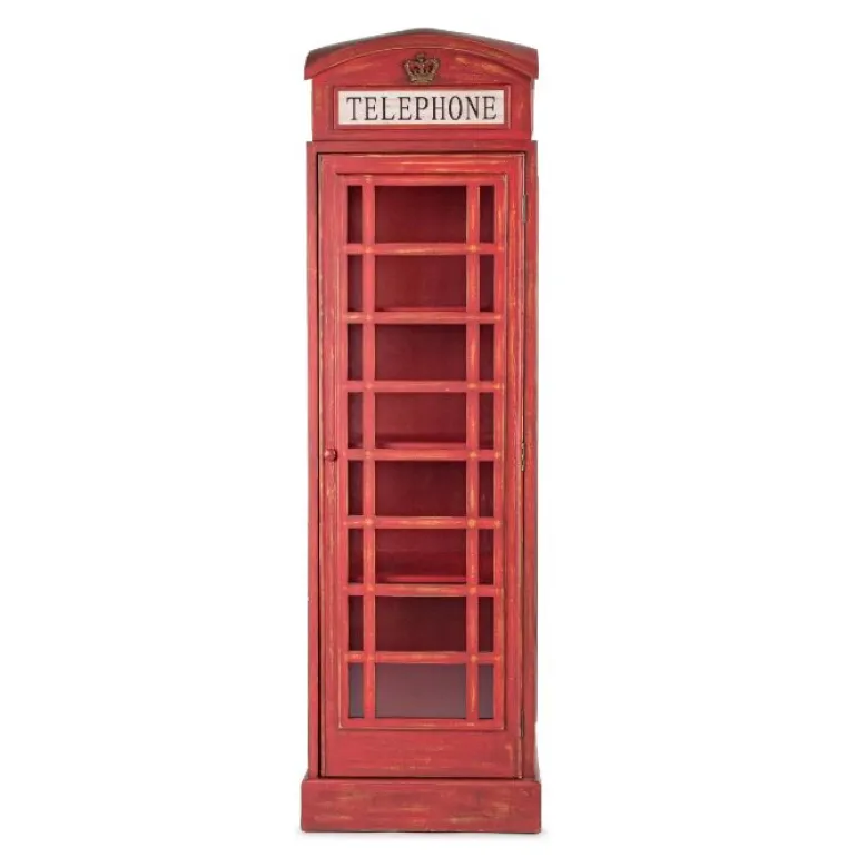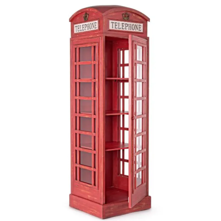 Estructura de madera de abeto y paneles y baldas de dm. Pomos de madera y vitrina de vidrio.