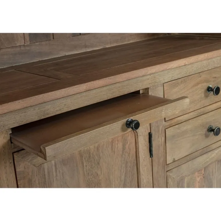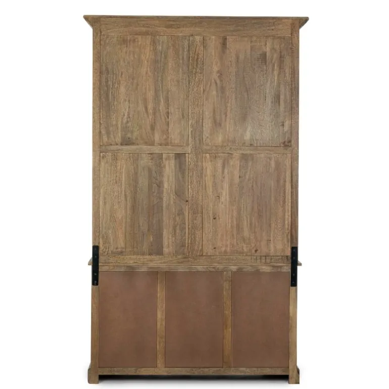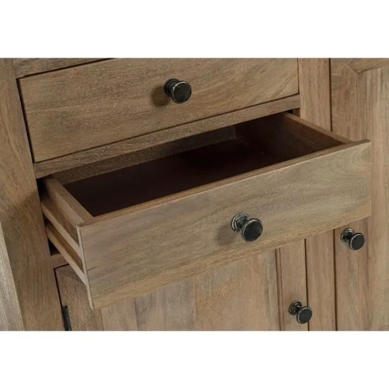 Estructura de madera de mango, dorso del mueble y fondo de los cajones de dm. Escalera decorativa de mango. Acabado al agua. Tiradores de fundición de hierro.