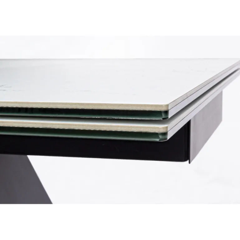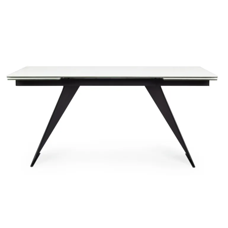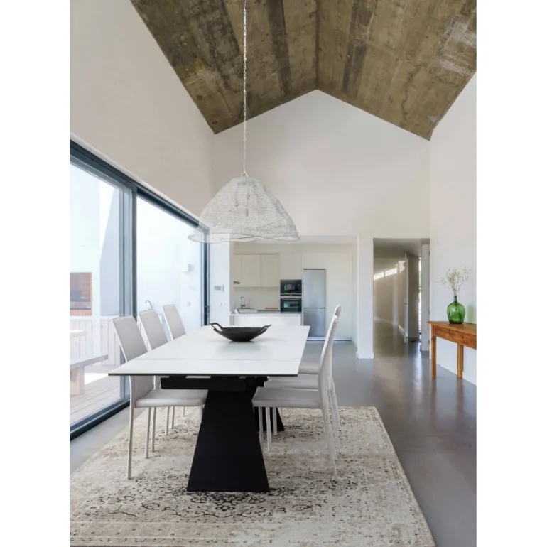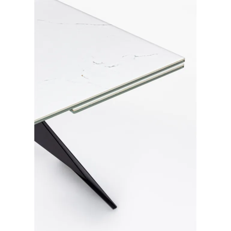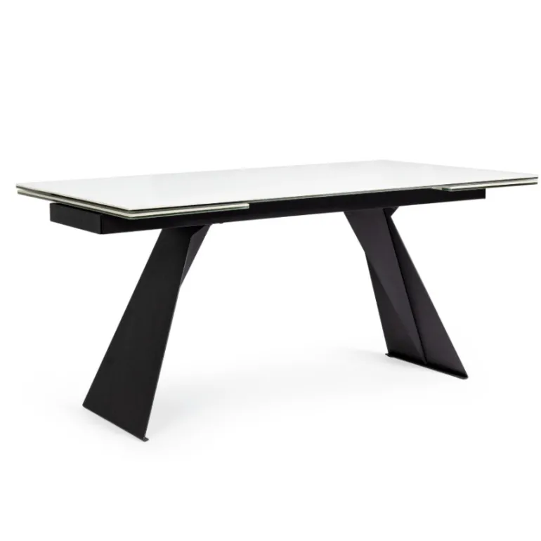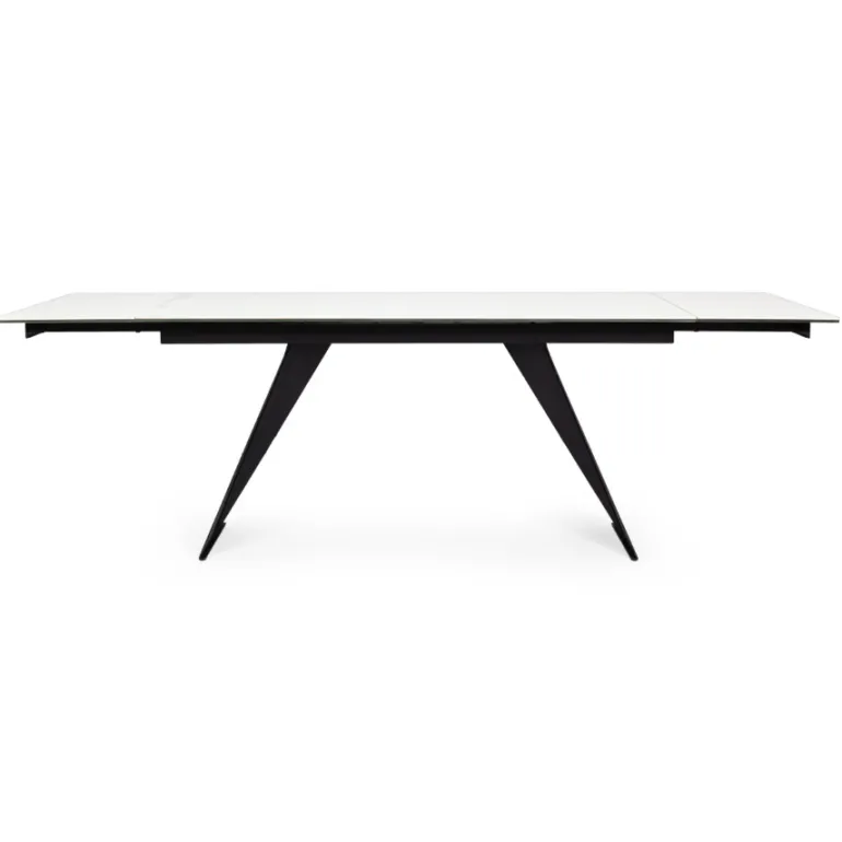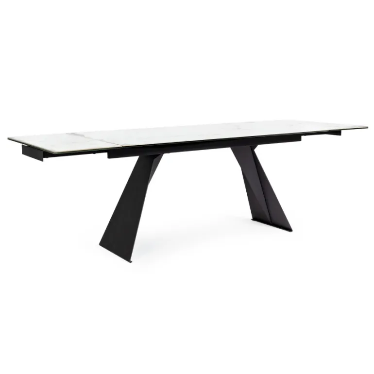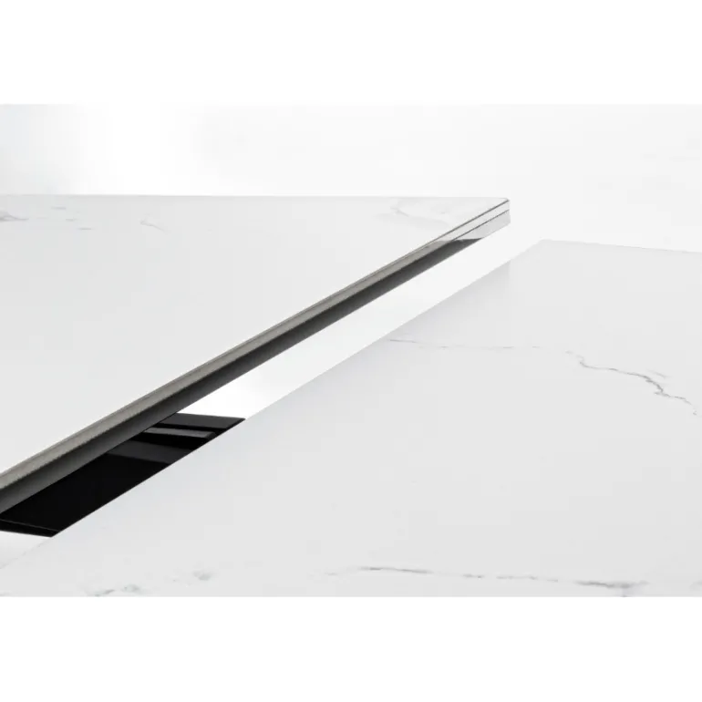 Esta preciosa mesa de comedor extensible decerámica blanca de 5mmsobre cristal templado de 8mm, super resistente y duradera, con patas de acero en color negro con revestimiento de epoxi para mayor durabilidad. Extensible hasta 240 cm. de largo. Para de 8 a 10 comensales.