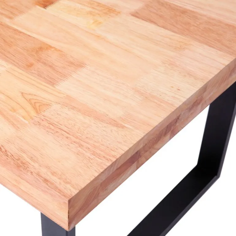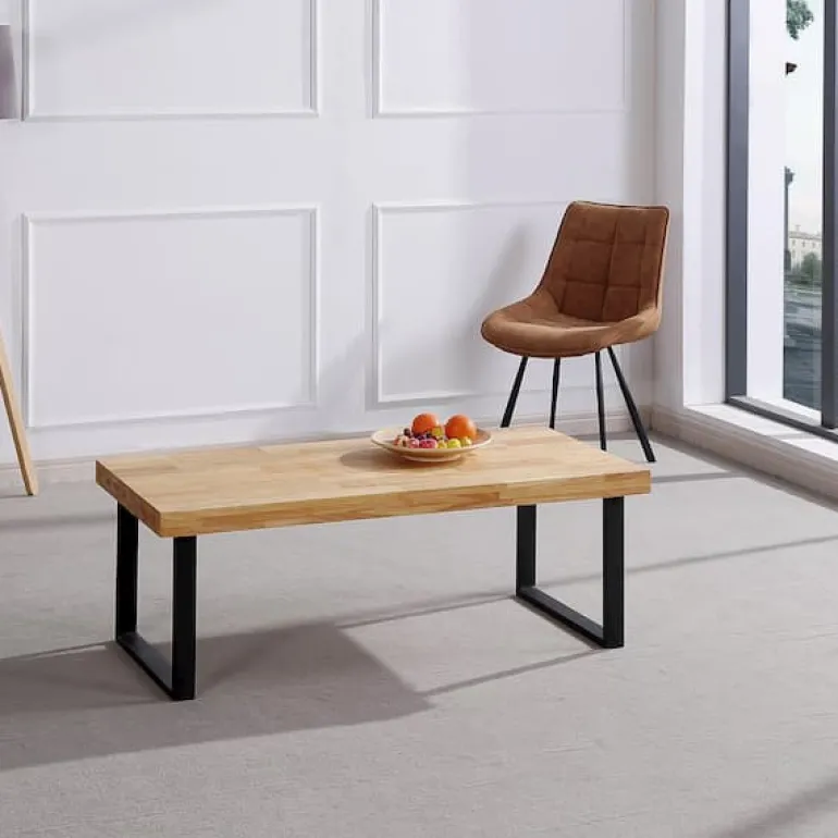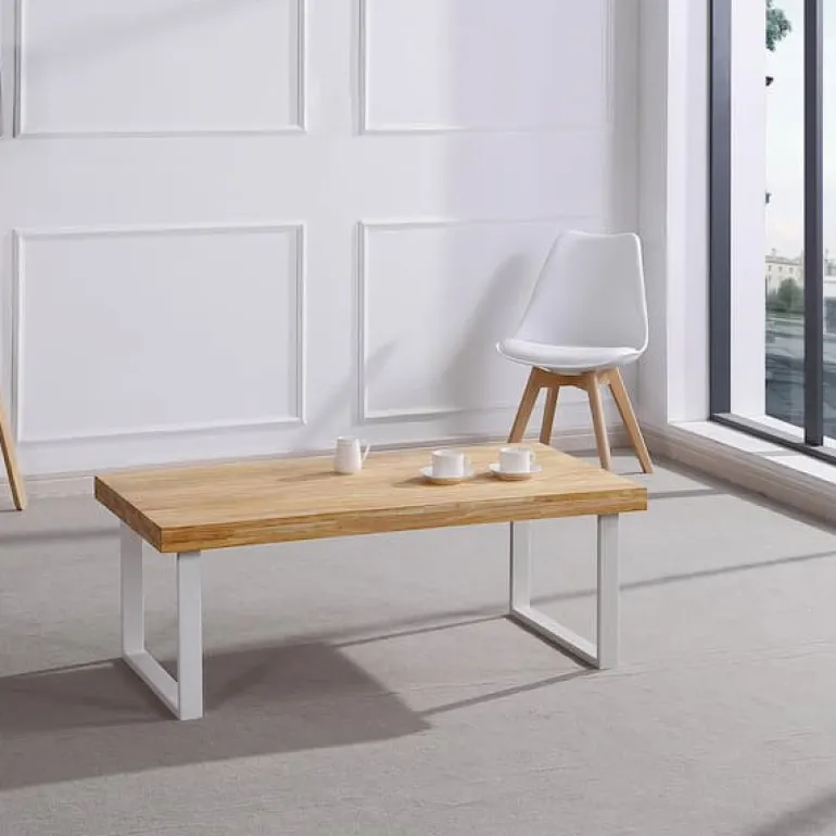 Mesa de centro de aspecto robusto por su estructura rectangular y metálica en negro o blanco, y tapa de de madera color roble de 54 mm. de grosor en color roble Americano y Nórdico. Con esta mesa podrás darle a tu espacio un estilo industrial urbano, destacando por su elegancia y singularidad.