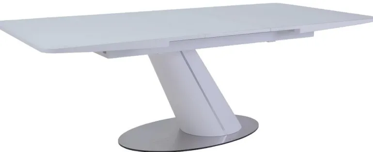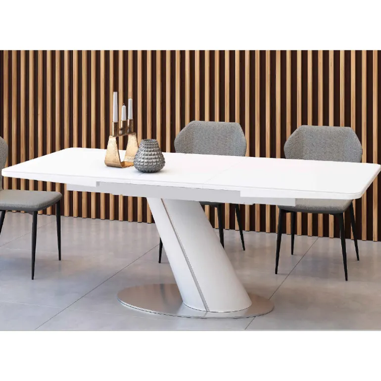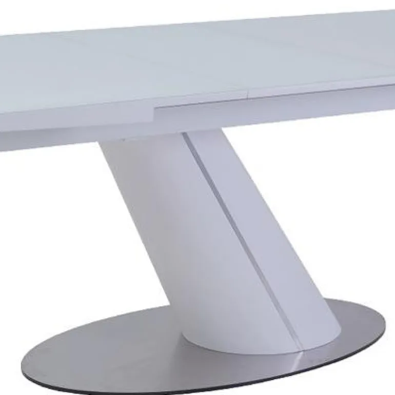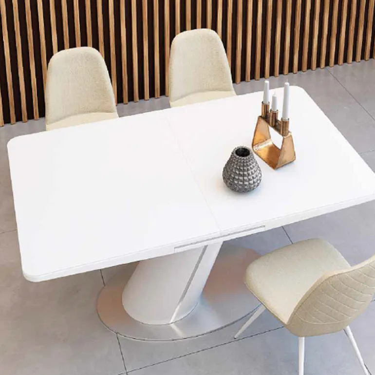 Moderna mesa extensible automática, con sobre de cristal supermate blanco óptico con cantos redondeados.