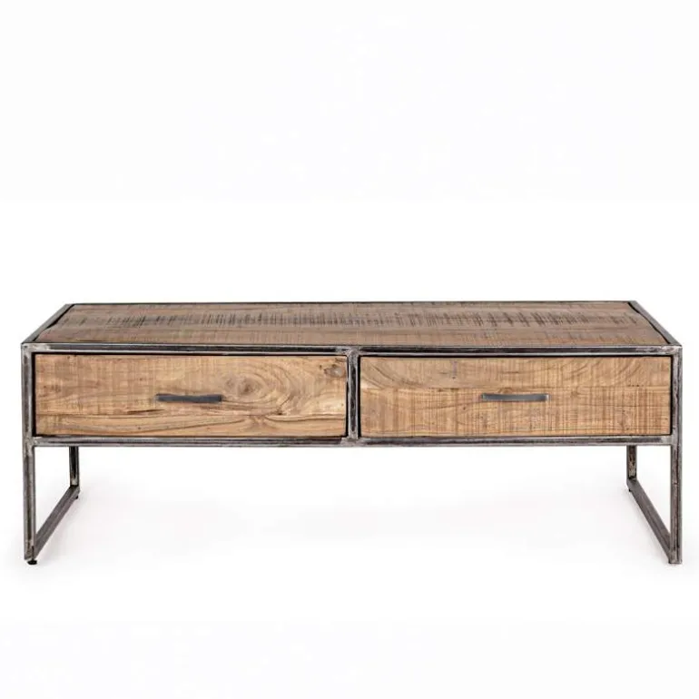 Mesa de centrode estilo industrial de madera de acacia con acabado acrílico protector y estructura de hierro. Con 2 cajones en los que guardar todo lo que necesites. Dos patas laterales de hierro.