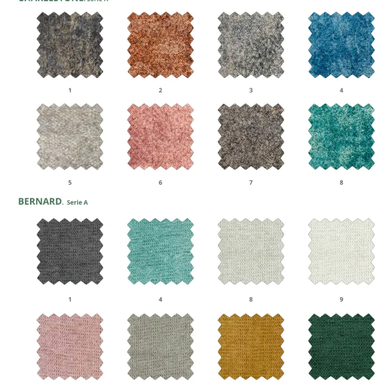 | Tapizado | BERNARD 1, BERNARD 10, BERNARD 12, BERNARD 14, BERNARD 16, BERNARD 4, BERNARD 8, BERNARD 9, CHARLESTONE 1, CHARLESTONE 2, CHARLESTONE 3, CHARLESTONE 4, CHARLESTONE 5, CHARLESTONE 6, CHARLESTONE 7, CHARLESTONE 8, KAMALA 13, KAMALA 15, KAMALA 16, KAMALA 18, KAMALA 19, KAMALA 20, KAMALA 6, KAMALA 7 |