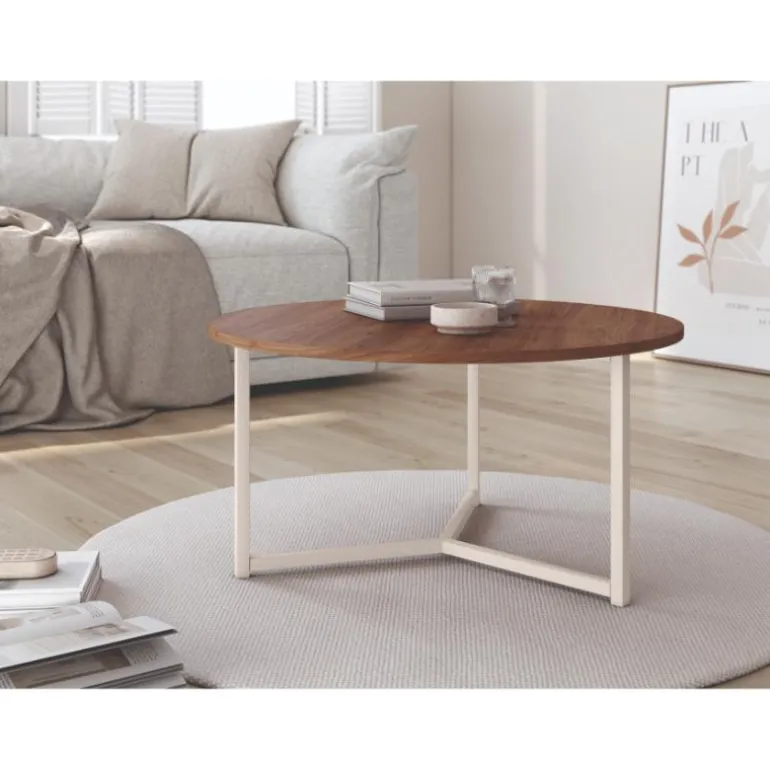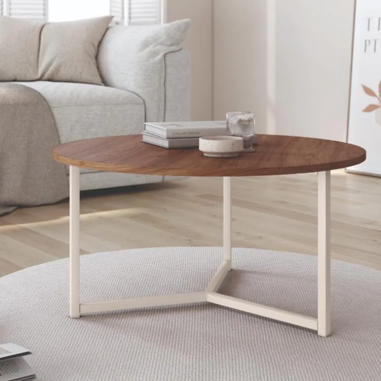 Mesa de Centro madison redonda en acabado ecomadera, con patasde hierro en acabado metálico blanco (también disponible en negro). Con un diseño muy actual, de estilo industrial urbano, pero que encaja en cualquier tipo de decoración a la perfeccin. Escoge la combinación que encaje mejor con tu estilo, las posibles combinaciones diferentes de maderas, con diferentes acabados a escoger.