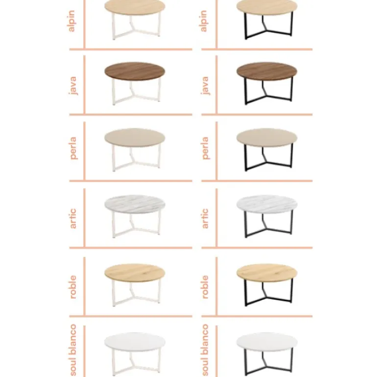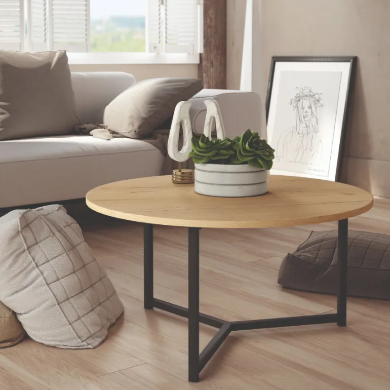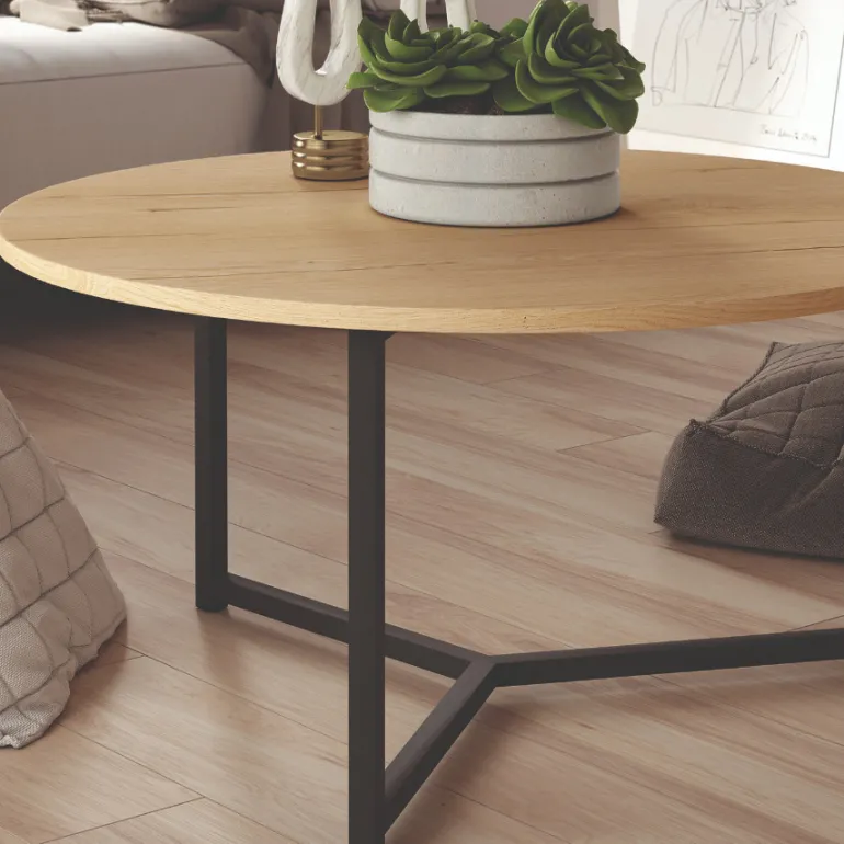 Mesa de Centro madison redonda en acabado ecomadera, con patasde hierro en acabado metálico negro (también disponible en blanco). Con un diseño muy actual, de estilo industrial urbano, pero que encaja en cualquier tipo de decoración a la perfeccin. Escoge la combinación que encaje mejor con tu estilo, las posibles combinaciones diferentes de maderas, con diferentes acabados a escoger.