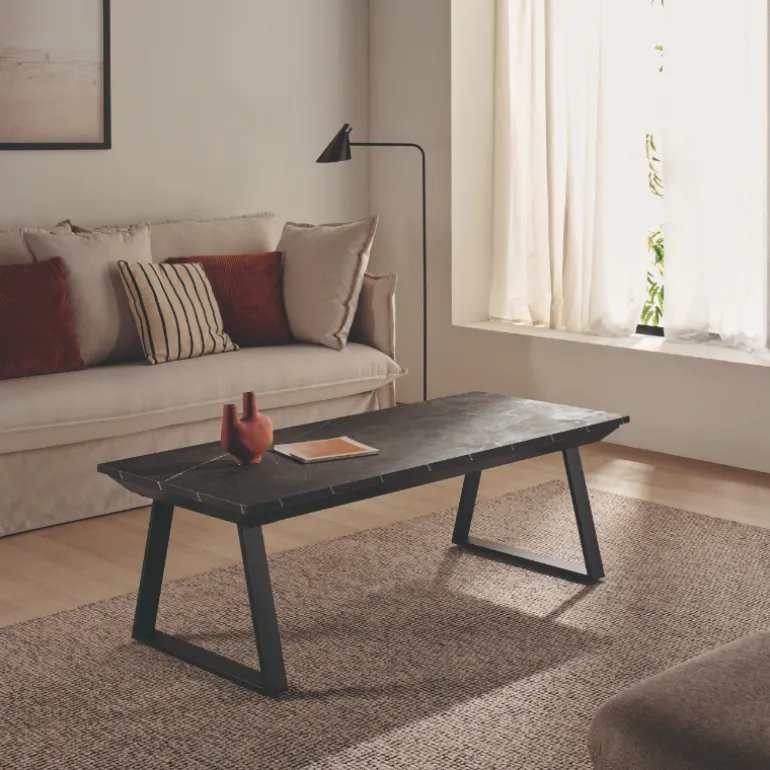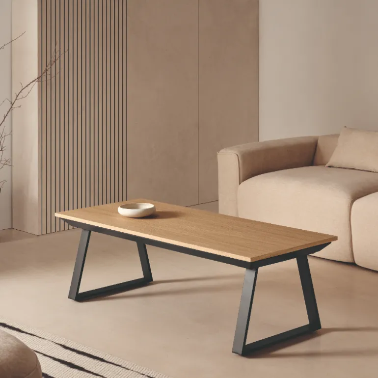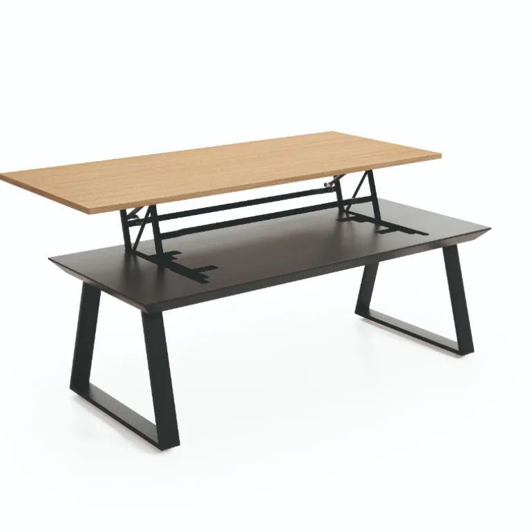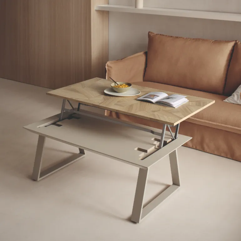 Moderna mesa de centro fabricada en diferentes Acabados en Chapa de Roble o Haya Natural, o en ecomadera melamínica. Elevable hasta 65 cm. de altura.