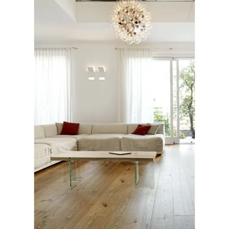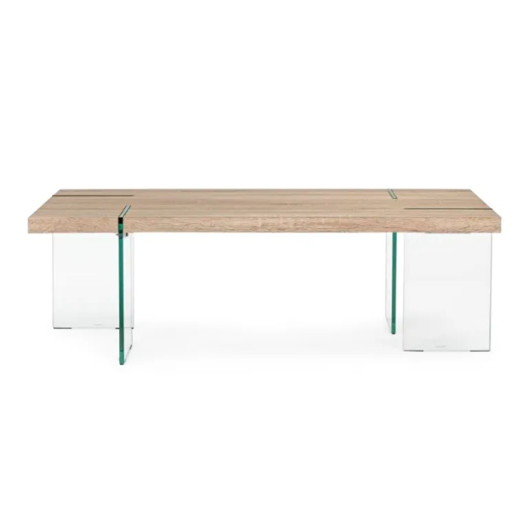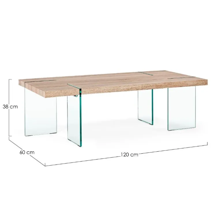 Patas de vidrio templado transparente con espesor de 12mm. tablero de dm recubierto con papel melamínico efecto madera