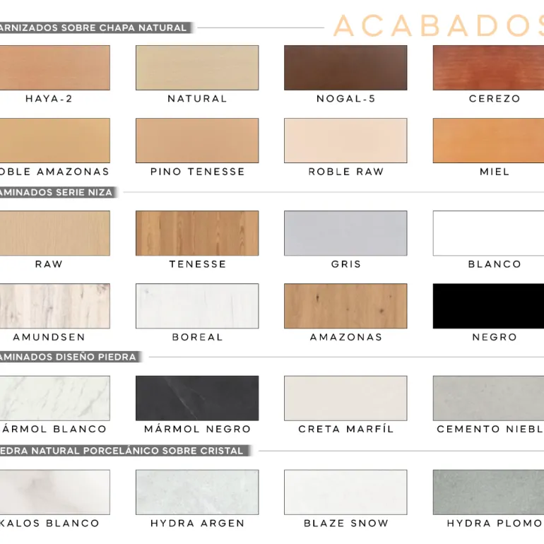 | Tapa | Amundsen, Boreal, Cemento Niebla, Creta Marfíl, Gris, Mármol Blanco, Mármol Negro, Roble Amazonas, Roble RAW, Roble Tenesse, Blanco, Negro |