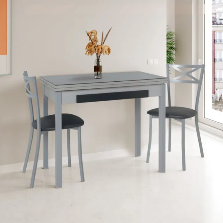 Mesa de cocina extensible tipo libro. Con estructura y patas metálicas en diferentes colores. Con opción de tapa en laminado o cristal en diferentes colores a escoger. Con un diseño muy actual y práctico, pero que encaja en cualquier tipo de decoración a la perfección.