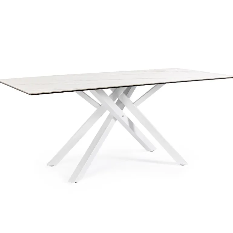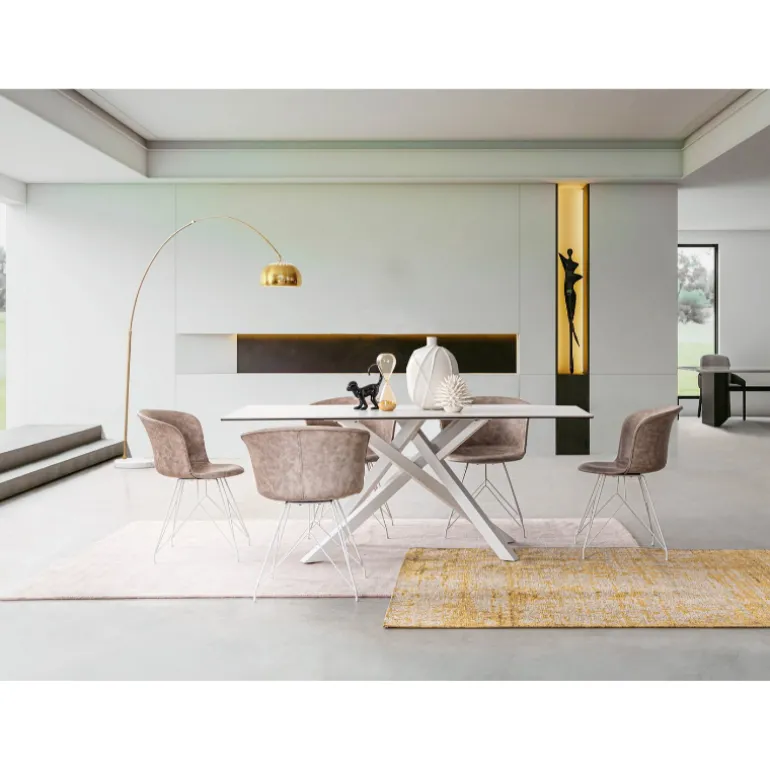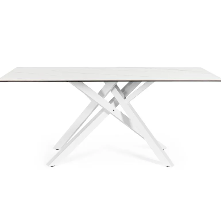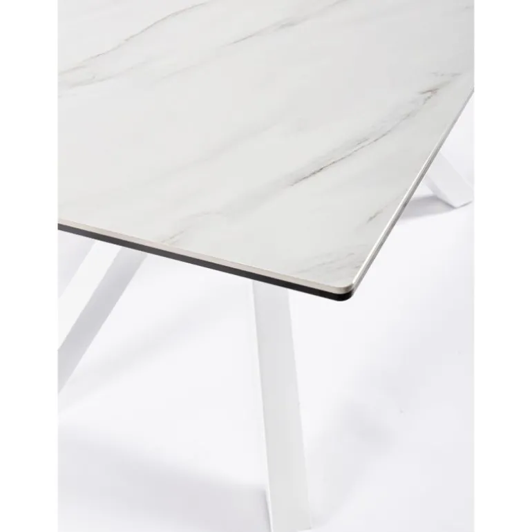 Moderna mesa de comedor blanca con tablero de cerámica (5mm) y soporte de vidrio templado (8mm), con dos patas de acero unidas por el centro muy moderna, que forman una estructura muy elegante y estilosa.