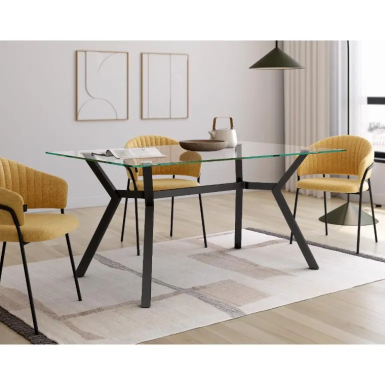 mesa de comedor cristal con patas de hierro en acabado metálico negro, un acabado en cristal templado muy resistente. Perfecta para de 6 a 8 comensales. Mesa de comedor cristal con un diseño muy actual, de estilo industrial urbano, pero que encaja en cualquier tipo de decoración a la perfección. Escoge la combinacin que encaje mejor con tu estilo. También en versión con tapa de combinaciones diferentes de maderas, con diferentes acabados a escoger de ecomadera. Mesa de comedor cristal con Patas de estilo moderno con diseño poligonal.