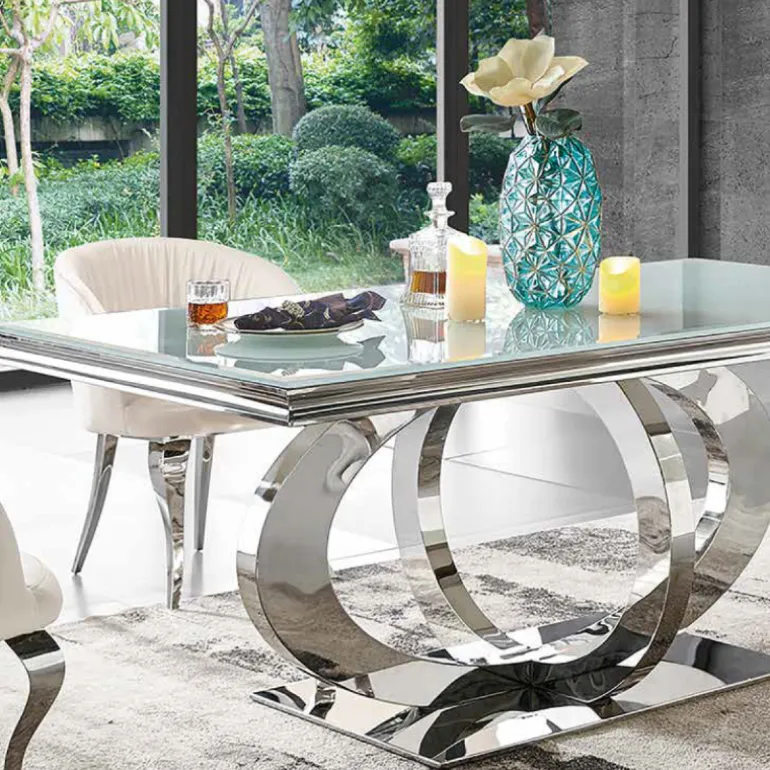 Mesa de comedor cromada Universo, con encimera de cristal templado blanco. es una espectacular mesa de 1,8 metros para de 4 a 6 comensales. Por sus formas y estilo podrás ubicarlo tanto en ambientes modernos como clásicos con aires renovados.