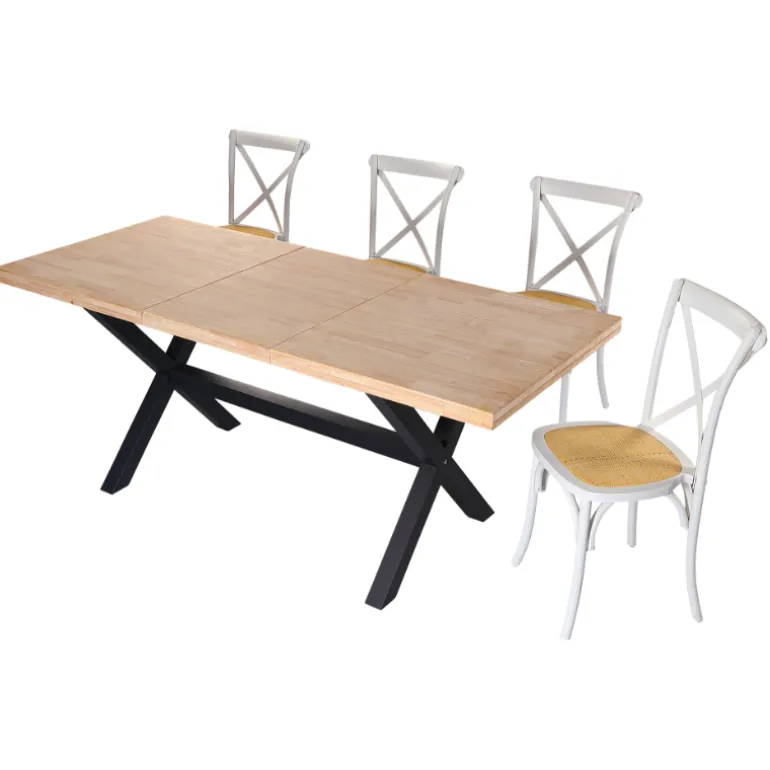 Mesa de comedor extensible de madera de roble maciza (fabricado a base de láminas de madera maciza entrelazadas) y patas gruesas forjado color negro con travesaño central, con con topes de suelo regulables en altura, para evitar que cojee. Con 2 extensiones de 40cm cada una, extendiéndose de 140cm a 180cm y 220cm.
