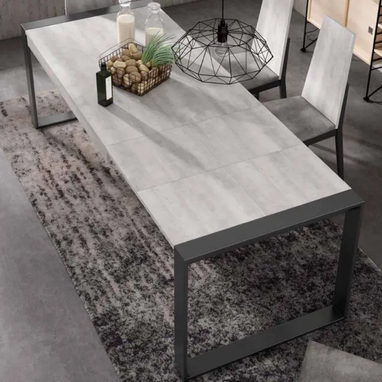Mesa de comedor de ecomadera con patasde hierroen acabado metálico. Con un diseño muy actual, de estilo urbano minimalista, pero que encaja en cualquier tipo de decoración a la perfección. Escoge la combinación que encaje mejor con tu estilo, ente multitud de posibles combinaciones diferentes, con diferentes acabados a escoger de ecomadera y laminados fenólicos que imitan roca, óxido, cemento y pizarra, así como metálicos para las patas.
