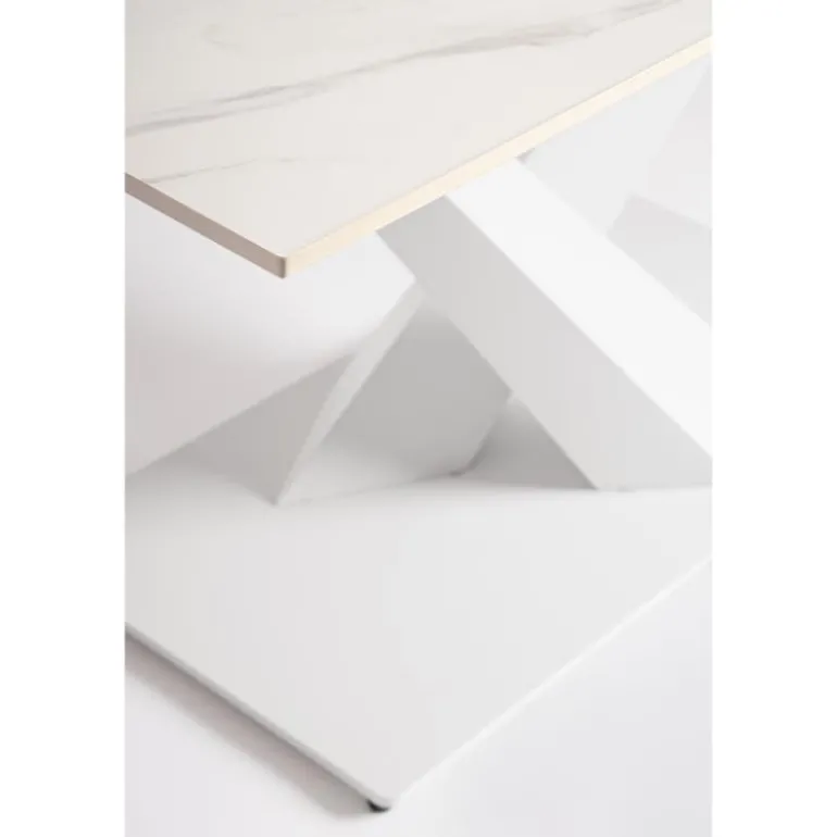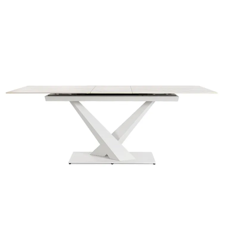 Moderna mesa de comedor extensible blanca con tablero de gres porcelánico con efecto mármol, con 2 patas de acero barnizadas en polvo epoxi, que terminan en una base de acero con soportes para evitar rallar el suelo, muy moderna, que forman una estructura muy elegante y estilosa.