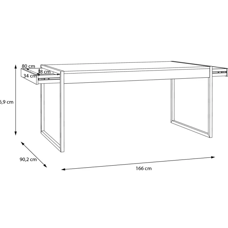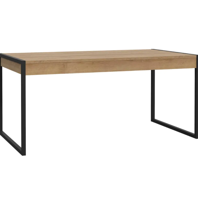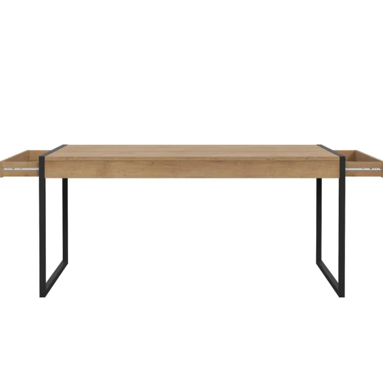 Moderna mesa de comedor en acabado melaminico roble y patas metálicas forjadas negras, acabado con relieve al tacto. Incluye2 cajonesde 80*34*8cm. perfectos para guardar mantel, servilletas, cubertería,o incluso el ordenador portátil. Con un diseño muy moderno en dos tonos que combinan a la perfección con cualquier espacio y mobiliario.