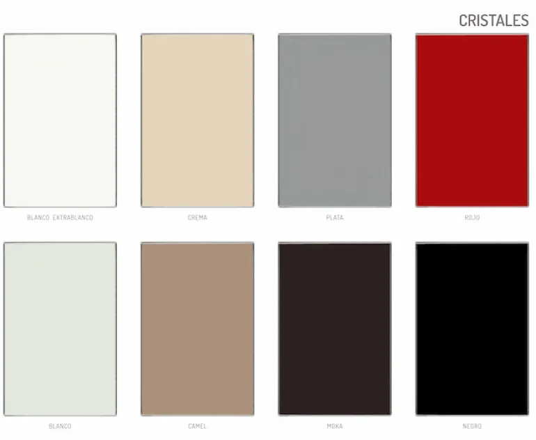 | Cristal | Estrablanco, Extra-transparente, Crema, Plata, Rojo, Blanco, Camel, Moka, Negro |