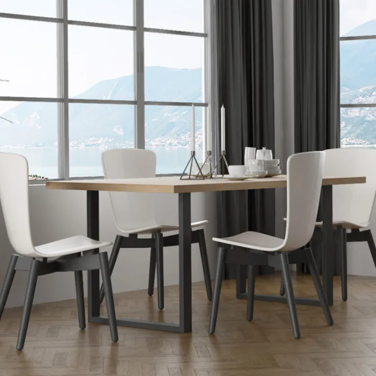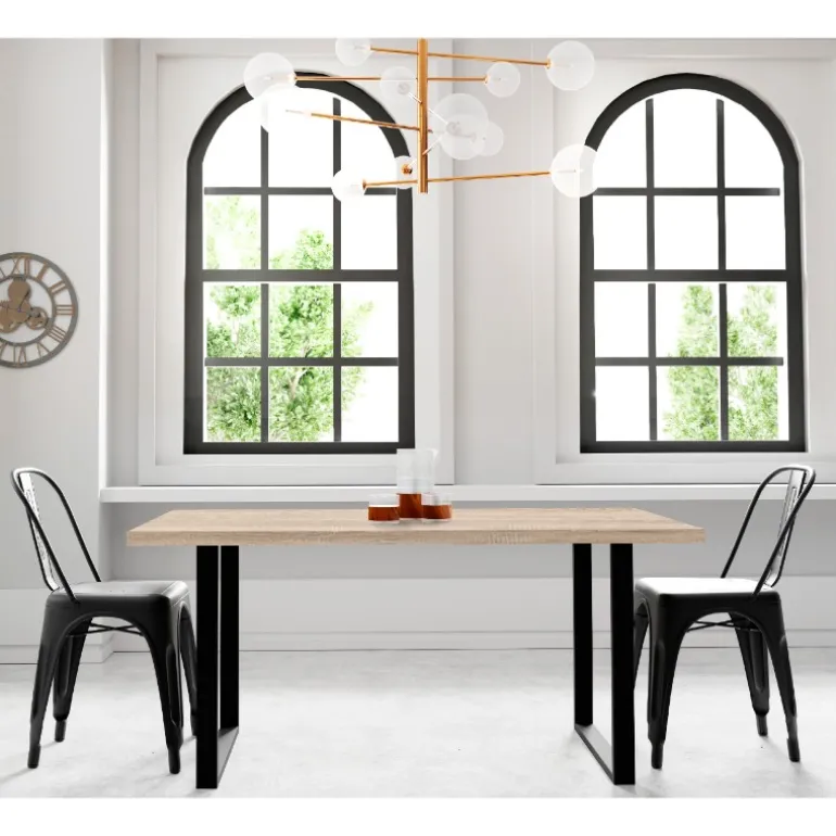 Moderna mesa de comedor fija en acabado melamínico roble y patas metálicas forjadas negras, acabado con relieve al tacto. En 3 medidas diferentes de 140, 160 y 180 cm de largo. Con un diseño muy moderno en dos tonos que combinan a la perfección con cualquier espacio y mobiliario.