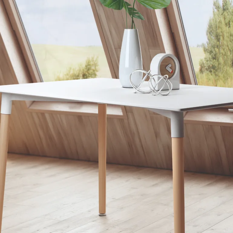 Mesa de comedor con patas en acabado haya natural, un acabado en laminado muy resistente. Mesa de comedor de comedor Perfecta para de 4 a 6 comensales. Una mesa de comedor con un diseño muy actual, de estilo industrial urbano, pero que encaja en cualquier tipo de decoración a la perfección. Escoge la combinación que encaje mejor con tu estilo. A escoger tapa en combinaciones diferentes, con diferentes acabados a escoger de laminados.