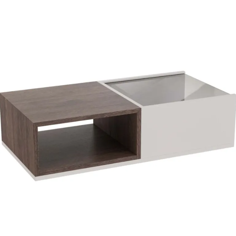 Disponible en múltiples acabados Chapa de Roble Natural, Chapa de Roble Poro Abierto o Lacado. Con posibilidad de combinar acabados entre el armazón y la base, donde incluye cristal templado, y el cubo central al gusto, que le otorga un contraste muy elegante, moderno y ligero.