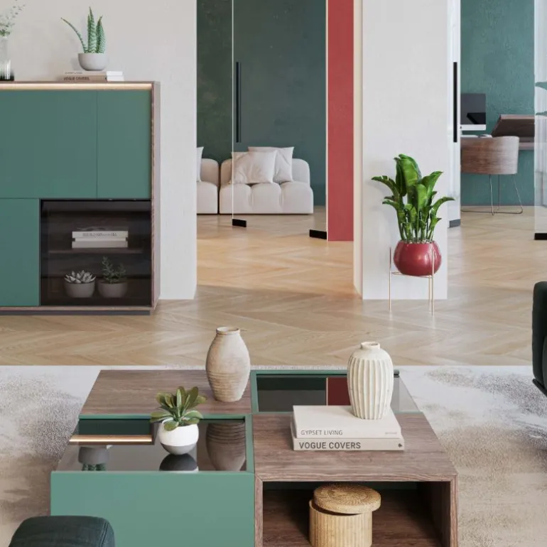 Disponible en múltiples acabados Chapa de Roble Natural, Chapa de Roble Poro Abierto o Lacado. Con posibilidad de combinar acabados entre el armazón y la base, donde incluye cristal templado, y los dos cubos al gusto, que le otorga un contraste muy elegante, moderno y ligero.