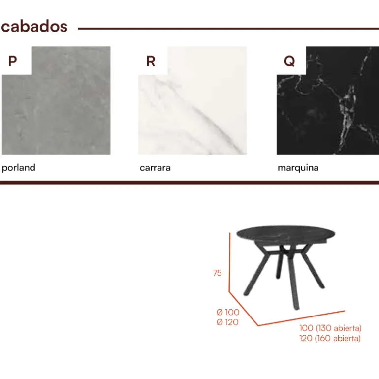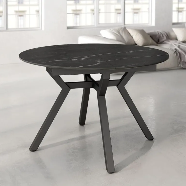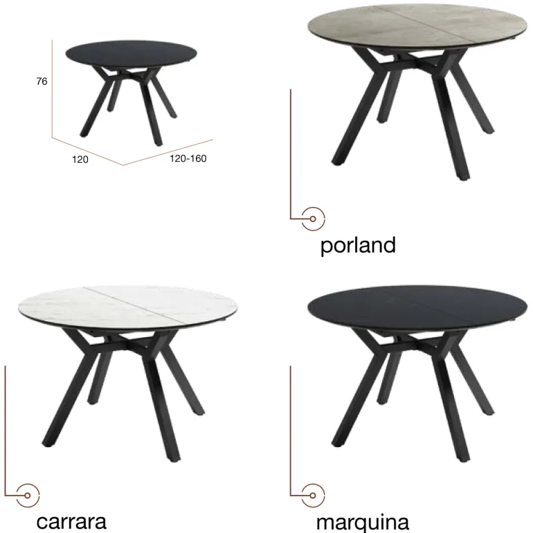 Mesa redonda extensible con encimera de mármol natural, con patas de hierro en acabado metálico negro, en tres acabados porcelánicos: Porlant, Carrara, Marquina (disponible en patas blancas en ésta web). Mesa redonda extensible en 2 medidas: 100 cm de diámetro extensible a 130 cm, y 120 cm de diámetro extensible a 160 cm, perfecta para de 4 a 6 comensales. Con un diseño muy actual, de estilo industrial urbano, pero que encaja en cualquier tipo de decoración a la perfección. Escoge la combinación que encaje mejor con tu estilo, las posibles combinaciones diferentes de maderas, con diferentes acabados a escoger.