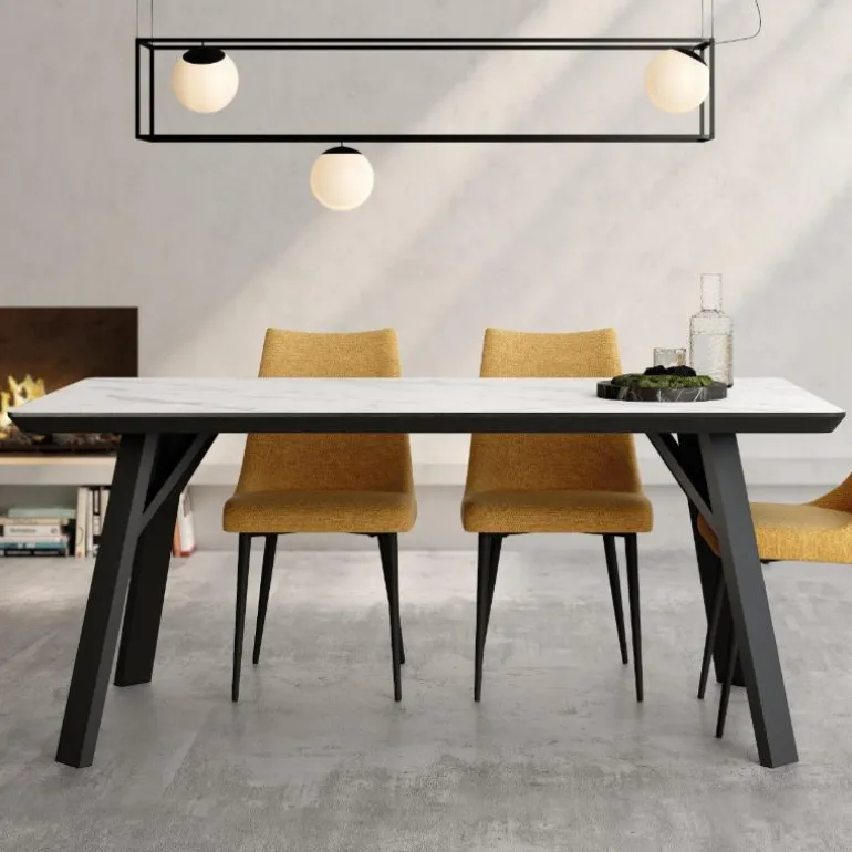 mesa extensible mármol de comedor con patas de hierro en acabado metálico negro, un acabado en imitación mármol muy resistente. Mesa extensible mármol Perfecta para de 6 a 8 comensales. Una mesa de comedor cristal con un diseño muy actual, de estilo industrial urbano, pero que encaja en cualquier tipo de decoración a la perfección. Escoge la combinación que encaje mejor con tu estilo. También en versión con tapa de combinaciones diferentes colores de mármol y metales.