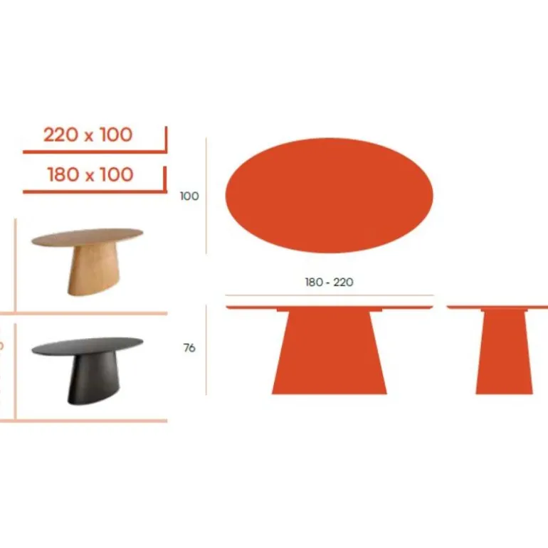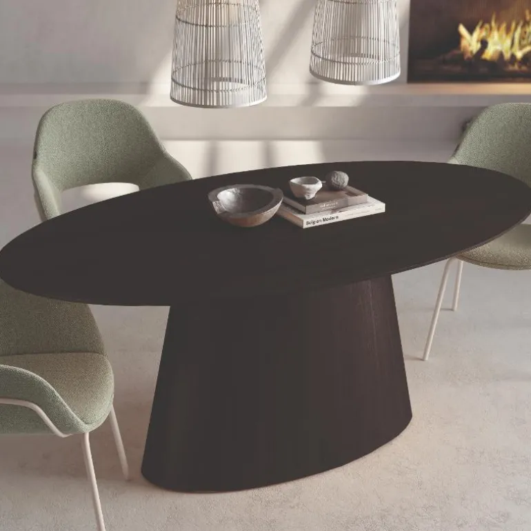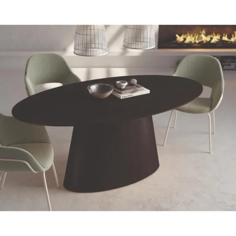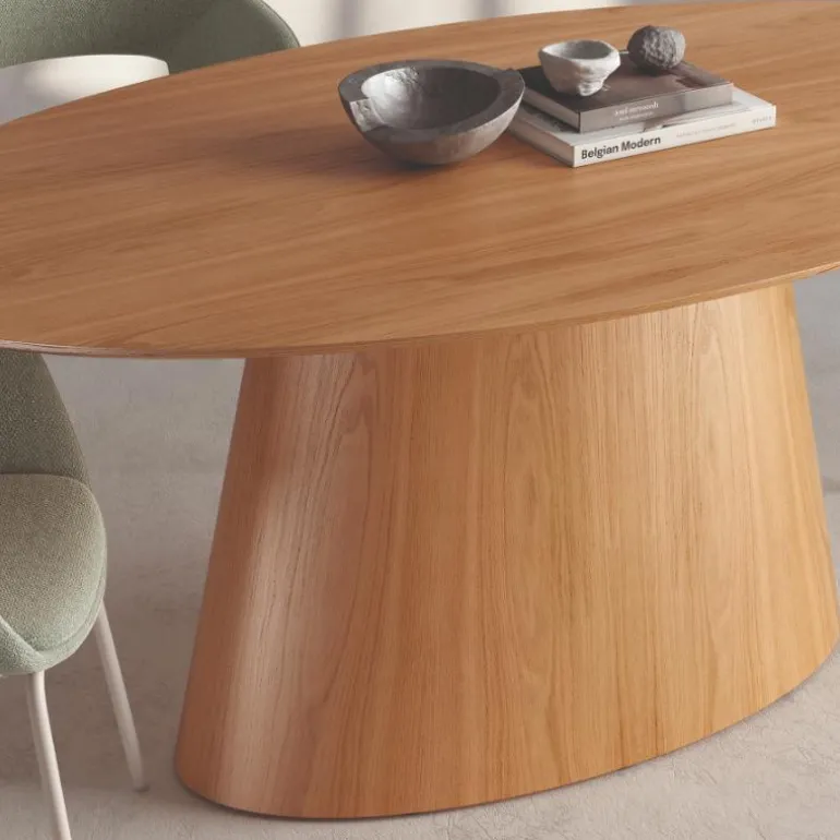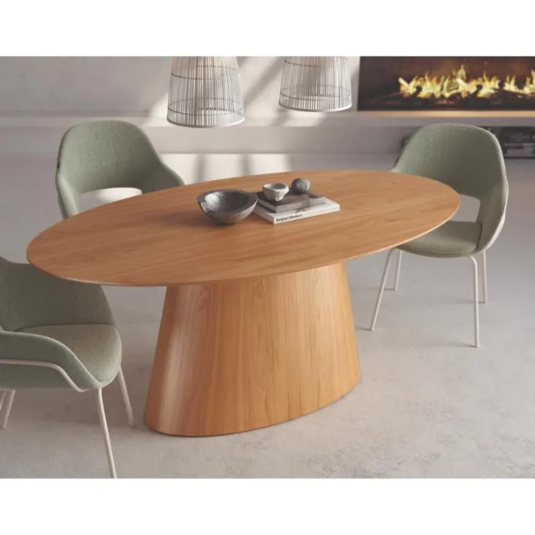 Mesa ovalada Desert, mesa de comedor ovalada con sobre biselado de 25mm, con una moderna pata centrar ovalada ancha en forma cónica. Para aquellos que quieren una mesa amplia de diseño moderno. Disponible en dos medidas: 180 y 220 cm de envergadura.